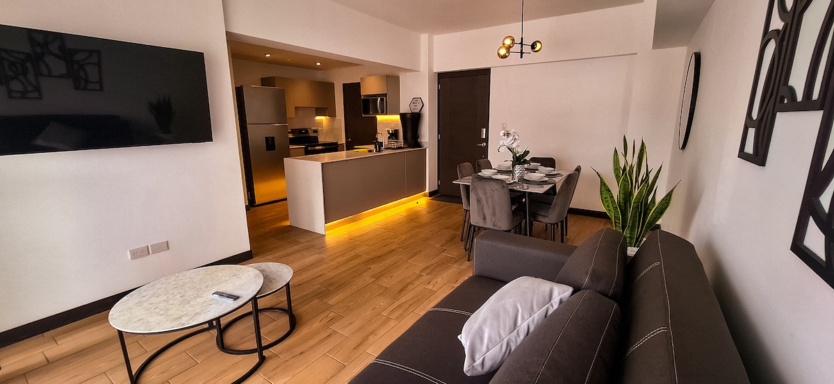 Disfruta de una experiencia con estilo en este alojamiento centrico el cuál se encuentra a unos pasos del Centro Comercial Interplaza Xela, lo que lo convierte en un espacio a tu favor, pues estarás cerca para encontrar restaurantes, cines, gimnasios, bancos, farmacias, y si tu plan es con niños encontraras un parque de juegos dentro del centro comercial y lo mejor es que el edificio cuentan con una sala lúdica. Si tu plan es laboral encontrarás áreas de coworking disponibles en el edificio.