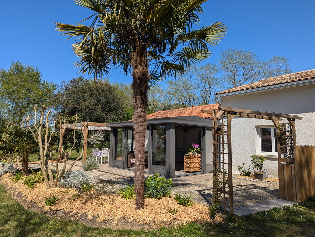 Détendez vous dans cette villa de 100 m2 confortable et élégante - Classée 4 étoiles "Étoiles de France". Au cœur des vignes et des plus grands vins du monde. L’océan à 15 minutes sur plus de 30 km de plage. Totalement rénovée, chaleureuse, lumineuse; cette charmante villa vous propose un bel espace de vie de 45 m2, cheminée avec insert, cuisine, 2 belles chambres avec lits queen size, 1 chambre avec lits superposés, 1 salle de bain, douche à l’italienne, 1 véranda, 1 barbecue, 1 grand jardin .