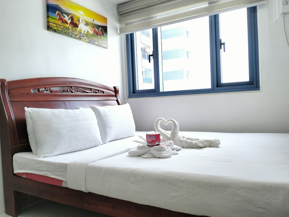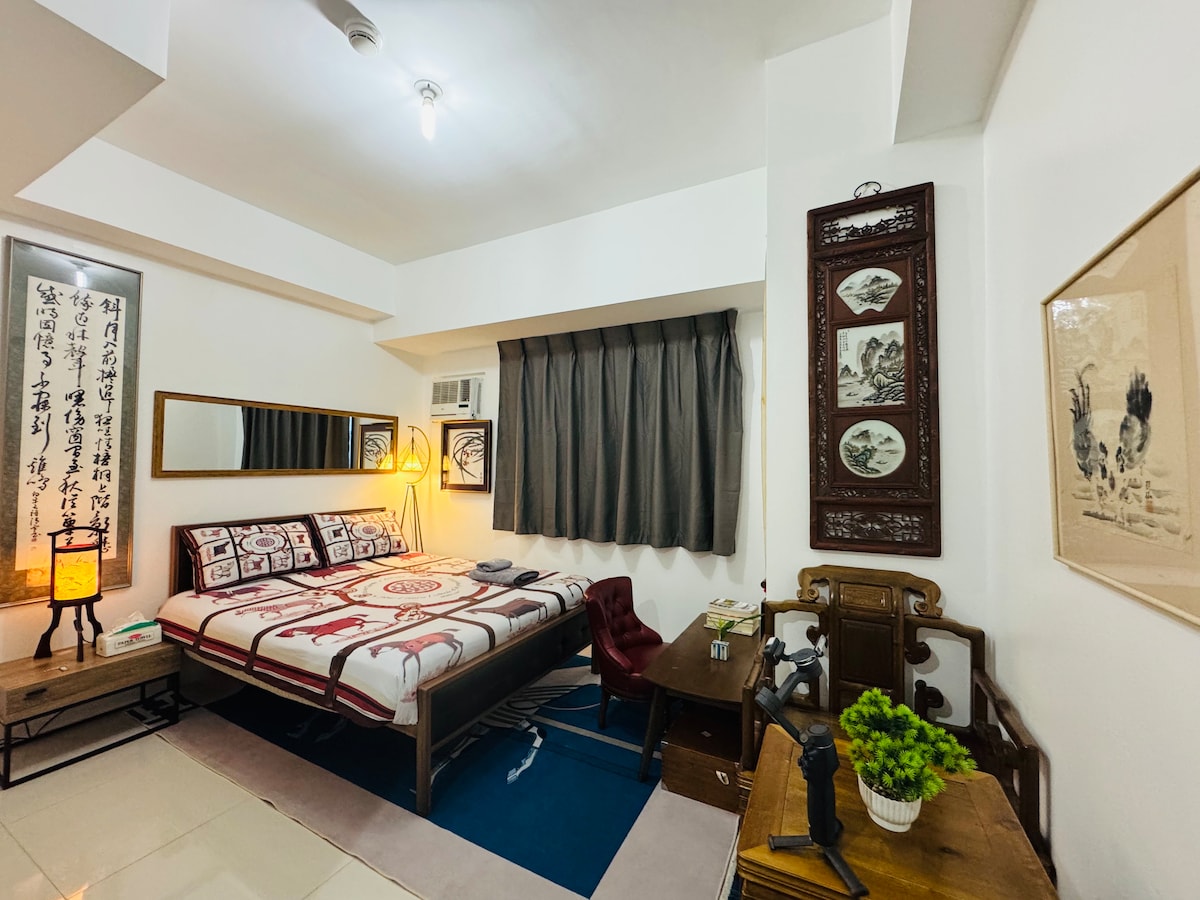 這間充滿東方風情的小套房,以原木家具、山水字畫和柔和燈光打造安靜角落。清晨陽光灑入,適合喝杯咖啡、寫日記。房內配置雙人床、Wi-Fi、冷氣、冰箱與微波爐,可簡單加熱食物,是情侶與單人旅客在馬尼拉灣畔休息充電的小窩。 This cozy studio is styled with oriental wooden furniture, calligraphy and warm lighting, creating a calm space to relax. Morning light comes through the window and you can enjoy coffee at the desk. The room has a double bed, Wi-Fi, air-conditioning, fridge and microwave, ideal for solo travelers or couples exploring Manila Bay.