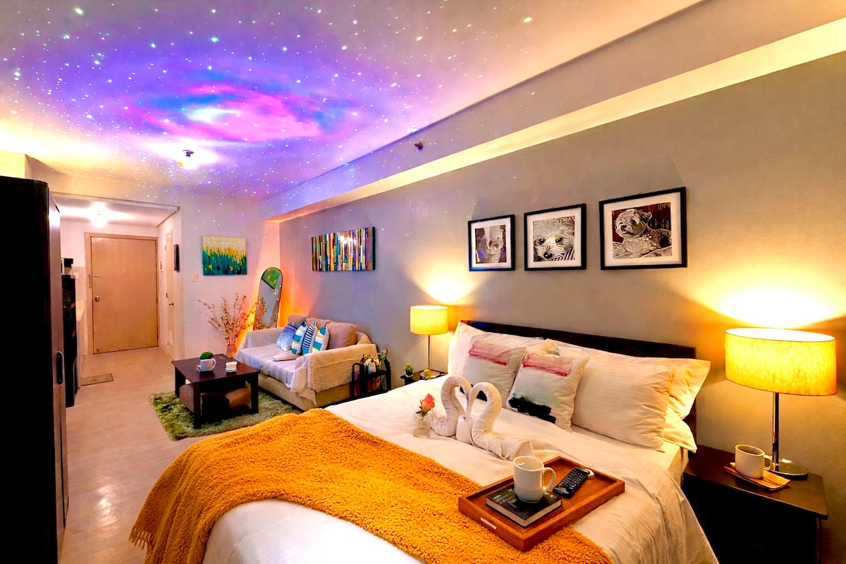 Step into your own little escape in the city a 31 sqm Japanese inspired condo where tranquility meets nightlife energy. Wake up to peaceful city view, work by the window with a cup of coffee ☕, then wind down with Netflix under dreamy star lights ✨. This space is designed for modern city living: minimalist yet warm, stylish yet cozy. Whether you’re on a staycation, work-from-home grind, or a weekend night out in Tomas Morato, this unit lets you experience it all.