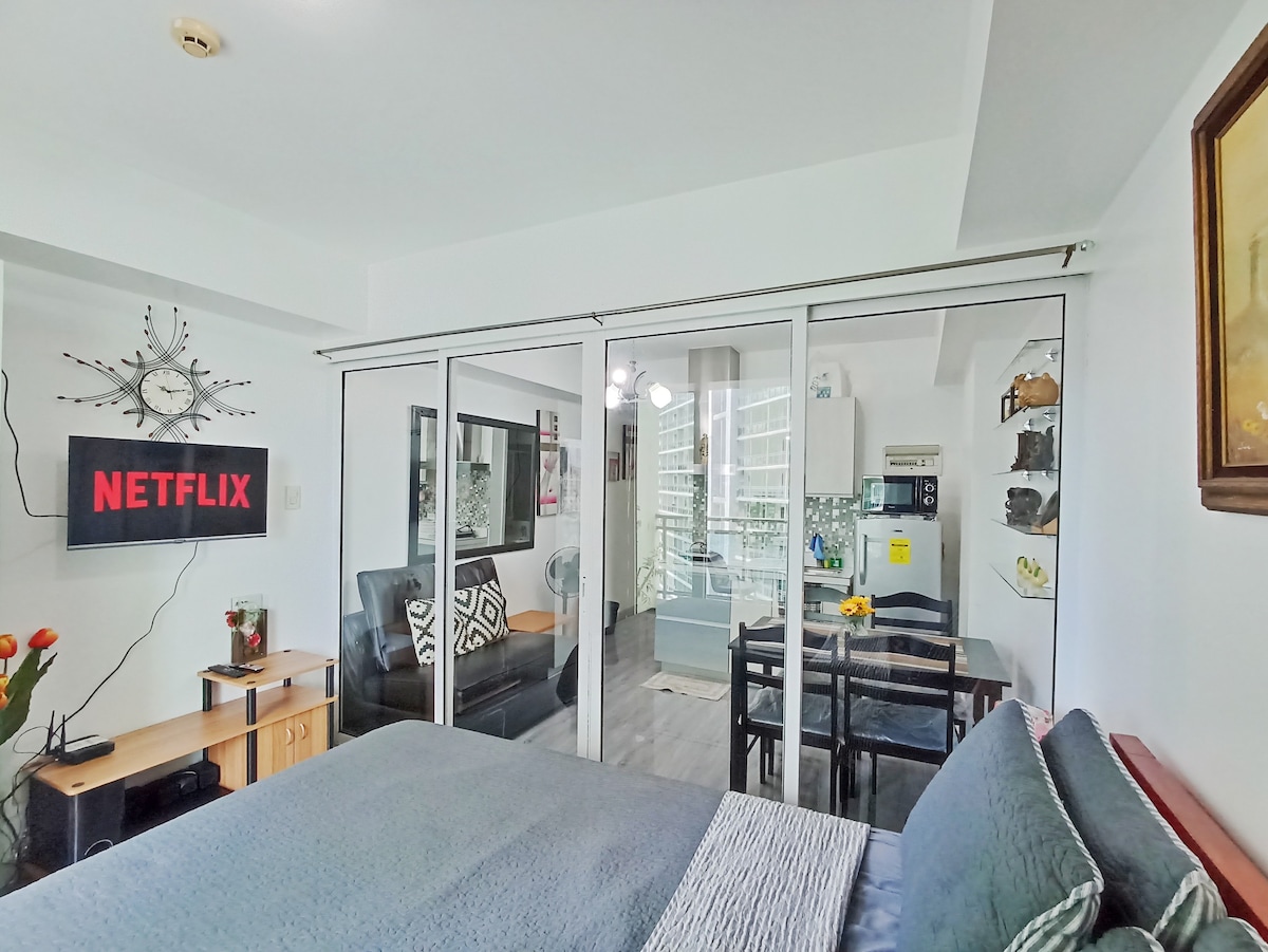 This Boutique Studio Unit comes with 55' Android TV, has its own mini kitchen, patio and own bathroom. The unit has a free WiFi,fast enough for work from home requirements about 250mbps internet speed The Apartment Unit is situated in an Executive Village, peaceful community w/ cafes, parks and convinience stores nearby. The Unit has a mini kitchen with rice cooker, air fryer, refrigerator, kitchenware, coffee press & electric kettle. The private bathroom comes with hot & cold shower and bidet.