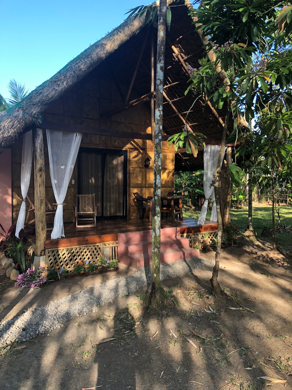 This is a dream cottage for adventurous romantics. It has a full-size bed (excellent for 1, snuggly for 2) , a view of the sea, a movable dining nook that overlooks the garden of Balai La-Hi. Sheets and towels are provided. This is an independent fan-cooled cottage beside the host house. Relax and feel the peace, You are safe here. Welcome home.