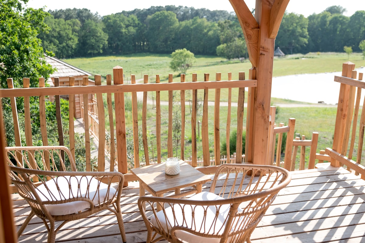 Nouvelle cabane cosy dans les arbres, pourvue d'une terrasse panoramique et d'un spa à bulles, Ehan est la parfaite chambre d'hôtel en pleine nature ! Alliant confort, romantisme et expérience insolite, cette cabane perchée est idéale pour se retrouver en amoureux... Bois cérusé, douche à l'italienne, coin salon de lecture et livres choisis, Ehan saura vous séduire le temps parenthèse enchantée. Choisir Dihan, c'est séjourner dans un domaine écoresponsable au cœur d'une nature préservée.