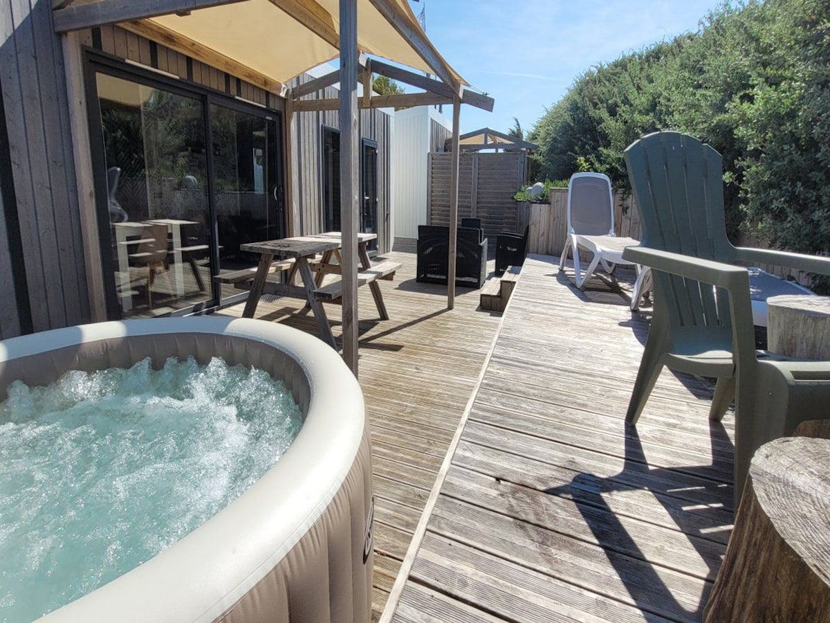 ✅ Tarif tout inclus ! Frais de ménage, draps et serviettes, lits faits, gel douche, café & thé le 1er jour, kit d'entretien, assistance 7/7. Super emplacement pour ce beau Mobile home tout neuf avec grande terrasse couverte et jardin clos situé à 200m de la plage et entouré de verdure. 2 chambres, salle de bain, douche italienne, cuisine équipée, séjour avec TV, grande terrasse couverte, jardin privatif clos, cabanon de jardin avec cuisine extérieure, barbecue, etc