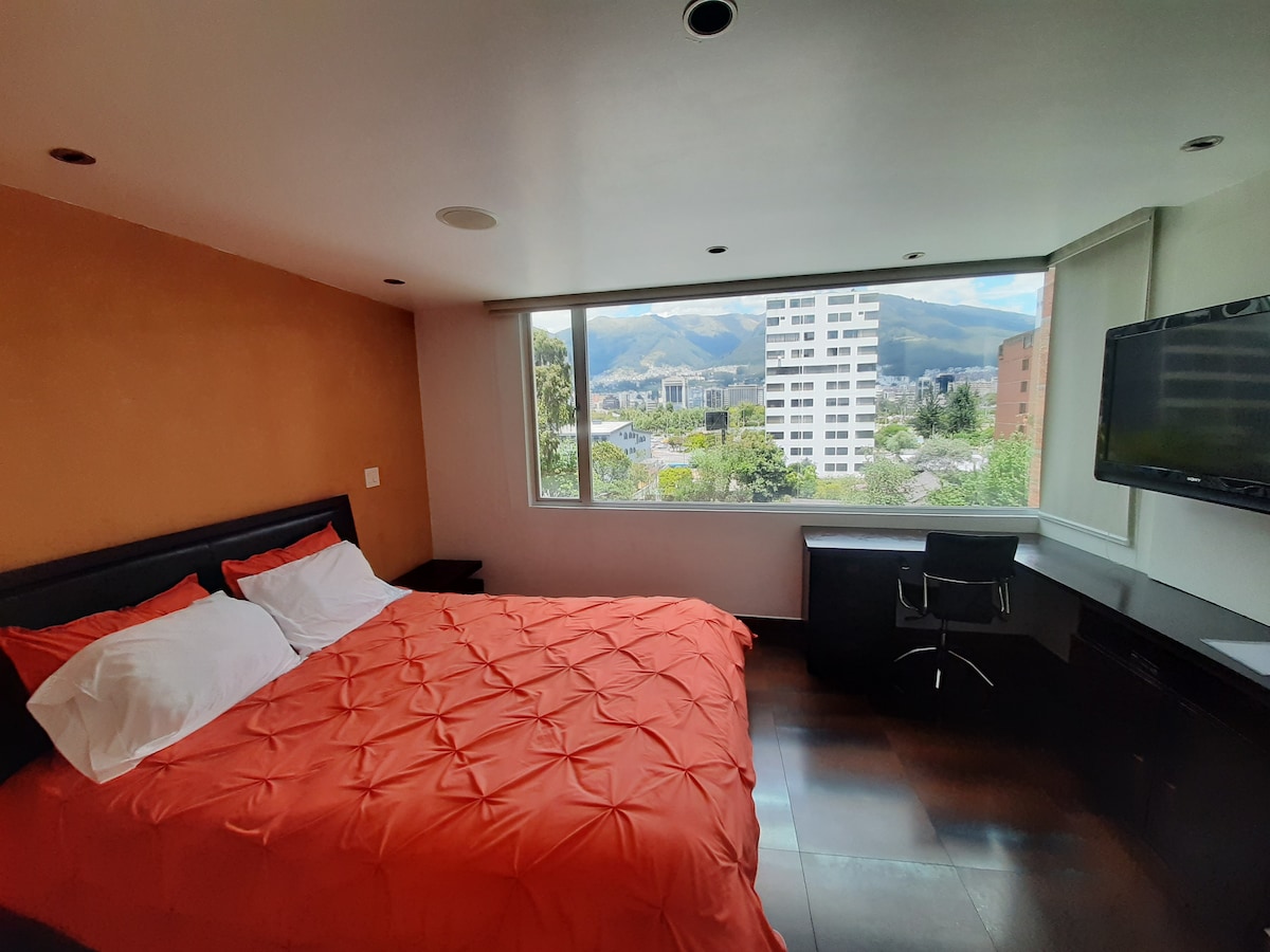 Disfruta de una experiencia con estilo en este alojamiento céntrico. Cercano al Quicentro Shopping, Estadio Olímpico Atahualpa, UDLA, Parque La Carolina, Parada de buses ECO VIA, sea tu visita por negocios o vacaciones en Quito este lugar te va a gustar. Queda en un edificio esquinero con lobby y ascensores, ubicado en el 4to piso con una hermosa vista a la ciudad, el edificio cuenta con un pequeño gimnasio y sala de lavanderías, existen restaurantes, tiendas y mucho más en el mismo conjunto.