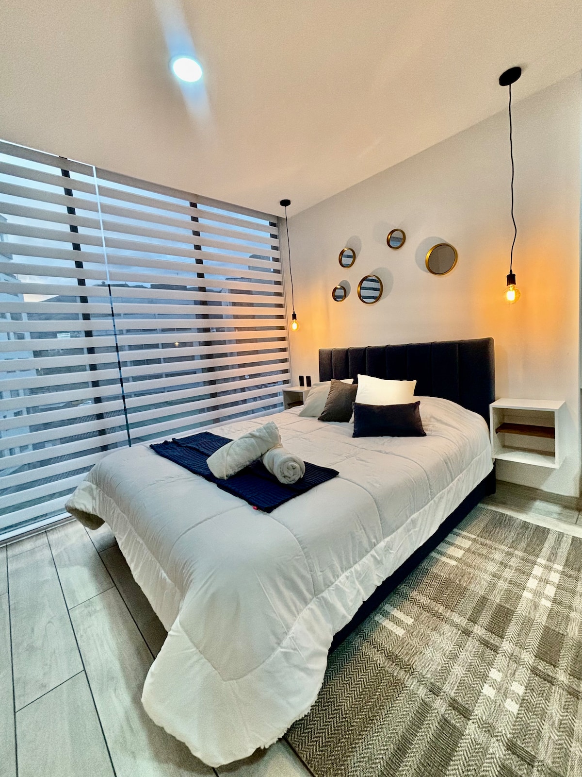 Spectacular suite located just across La Carolina Park. Imagine the view from the 17th floor, whether you're relaxing on the sofa or in bed. Features a fully equipped kitchen, fast internet, and you'll feel right at home. Easy walking access to the Subway, Mall El Jardín, and CCI. Pool - Sauna - Jacuzzi Well-equipped gym Incredible rooftop 60” Smart TV - Netflix Induction cooktop Refrigerator Laundry room inside the apartment Microwave Blackout curtains Clothes iron