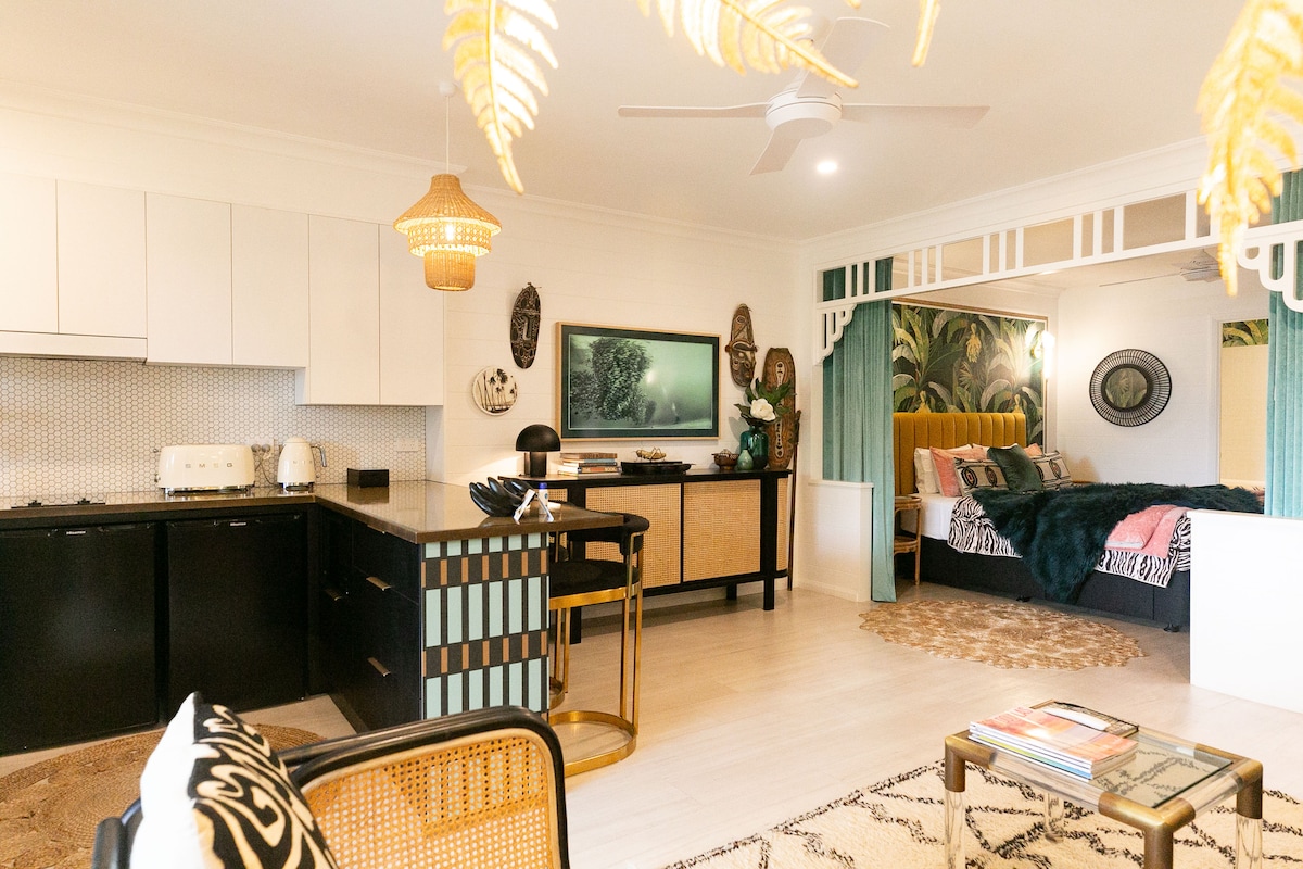 A room with a fantastic view, right in the heart of town! Refurbished with a colourful, ultra-tropical style, this large studio apartment is fun and vibrant. From your balcony, take in views of the Inlet, the mountains, the park, all right in town! Enjoy free, super-strong WIFI and Netflix connection, this apartment truly has it all!