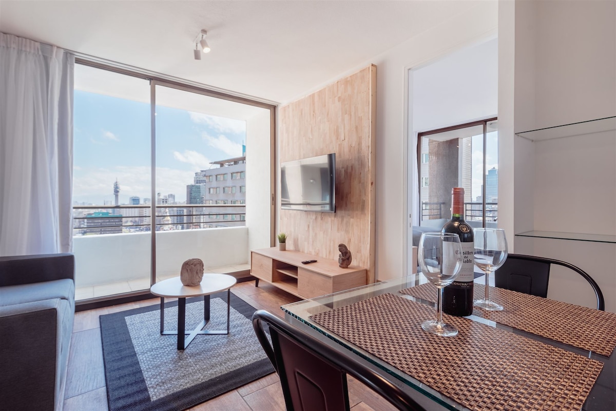 Depto de 1 dormitorio en suite con baño y closet, en el corazón de Santiago Centro. Piscina de temporada al aire libre y terraza. Amplia habitación, cocina totalmente equipada y agradable living comedor. TV (cable) y wifi. Estacionamiento privado y techado. ¡La ubicación es perfecta! Estás cerca del centro histórico de la capital, parques, supermercados y de los mejores restaurantes y bares del centro de la ciudad. Barrio tranquilo y seguro con acceso cercano a Autopista Costanera Norte.