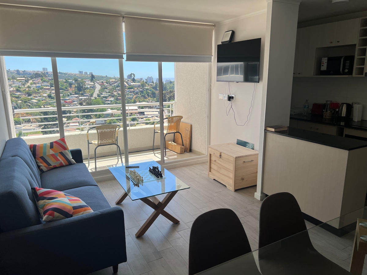 Moderno y acogedor departamento, ideal para descansar o trabajar en un entorno tranquilo con hermosas vistas. Cuenta con dos dormitorios (uno de ellos funciona como bodega), adaptado para tres personas, con cama de dos plazas y sofá cama de plaza y media. Cocina full equipada con utensilios, baño con ducha, amenities y toallas limpias. Smart TV con Netflix y cable, WiFi rápido (600 Mbps) y espacios luminosos con vista panorámica. A minutos de playas, restaurantes y centros comerciales.