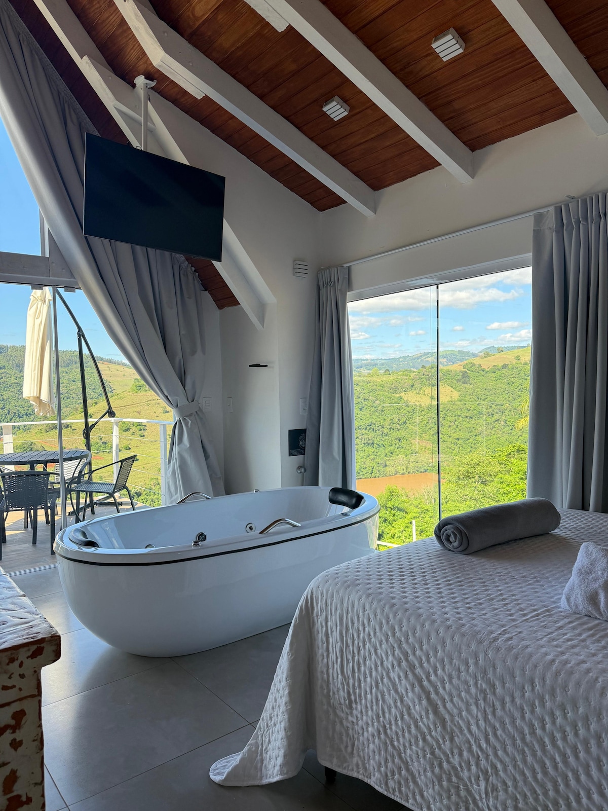 Relaxe neste espaço calmo e cheio de estilo. Um lugar único, com vista de tirar o fôlego com toda comodidade que um chalé pode proporcionar! Dispomos de uma pequena churrasqueira externa, fire pit (lareira externa), banheira de hidromassagem na parte interna, cozinha completa, cervejeira. Roupas de cama 100% algodão, mínimo 200 fios, toalhas de banho 500gr/m² e amenities L'Occitane, tudo para trazer uma ótima experiência aos hóspedes! Acesso fácil ao lago da Usina do Foz do Chapecó.