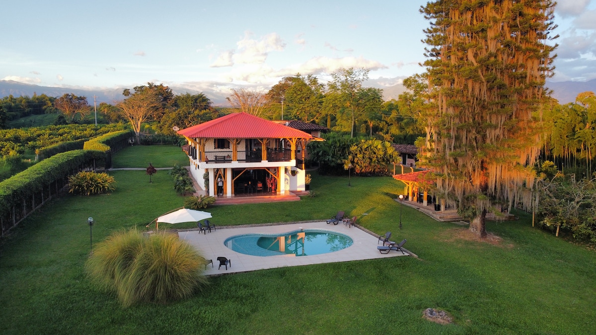 Diviértete con toda la familia en este alojamiento con estilo. Tenemos para ofrecerte esta nueva casa de campo, construida con muchas comodidades para que disfrutes de la naturaleza, cerca a todas las atracciones que ofrece el turismo rural del Eje Cafetero en Colombia. Tus días serán únicos. Decidirás si disfrutas de las instalaciones con tranquilidad, comodidad y bajo un sol acogedor en la nueva piscina, única en el lugar o si visitas los más fantásticos lugares y atracciones sector.