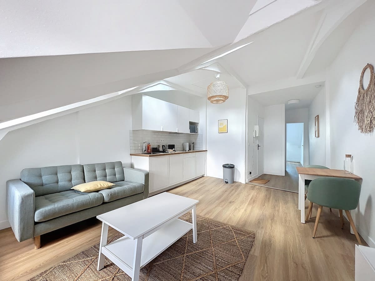 Pour votre séjour à Quimper, en vacances ou déplacement professionnel, nous vous proposons un appartement de 45 m2 ayant une situation exceptionnelle. Dans un quartier vivant mêlant commerces (restaurants, bar et supérette), cet appartement est situé dans un immeuble sécurisé (avec digicode) au 3ème étage sans ascenseur. Cet appartement indépendant de style nordique mansardé vous accueille par un bel escalier qui vous amène dans un séjour lumineux et spacieux.