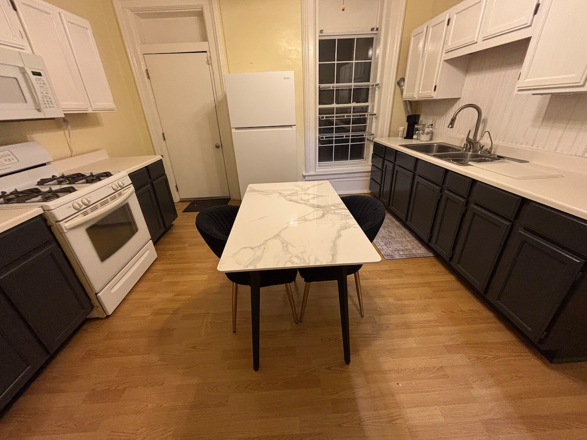 Centrally located in beautiful Quincy, Illinois! 1200 square feet of pure relaxation! This remodeled 2 bedrooms, 1 bath apartment is fully furnished. New frig and stove, kitchen is stocked with the essentials. Queen bed in master bedroom, and a twin bed in the second bedroom. Washer/Dryer included. Central ac/heat. Keyless entry, off street parking. High speed internet and smart TV. Outside outlet available for EV charging. Perfect venue for traveling professionals, or weekend stays