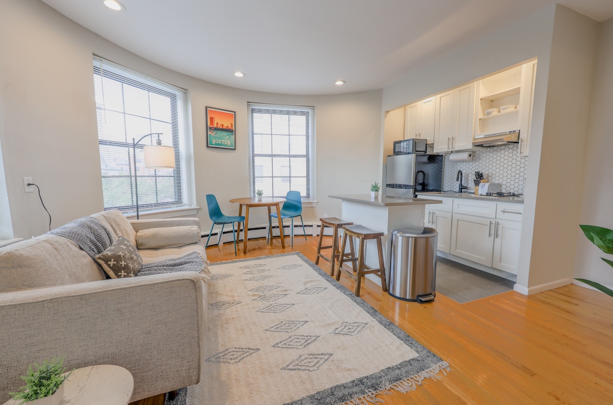 Experience Boston in this incredible eye-catching studio. Comes with a room divider for 1 bedroom like feel! Just a 5 min walk from the T and close to Boston College/Harvard, you can engage with all of Boston tastefully. Unit Features -> Blazing Fast WiFi -> 65” SmartTV with Streaming -> Fully Stocked Kitchen -> Washer & Dryer -> Comfortable Queen Bed Ideal for business travelers, couples, nurses, those in hospital treatment and everyone looking to experience Boston in comfort and peace.
