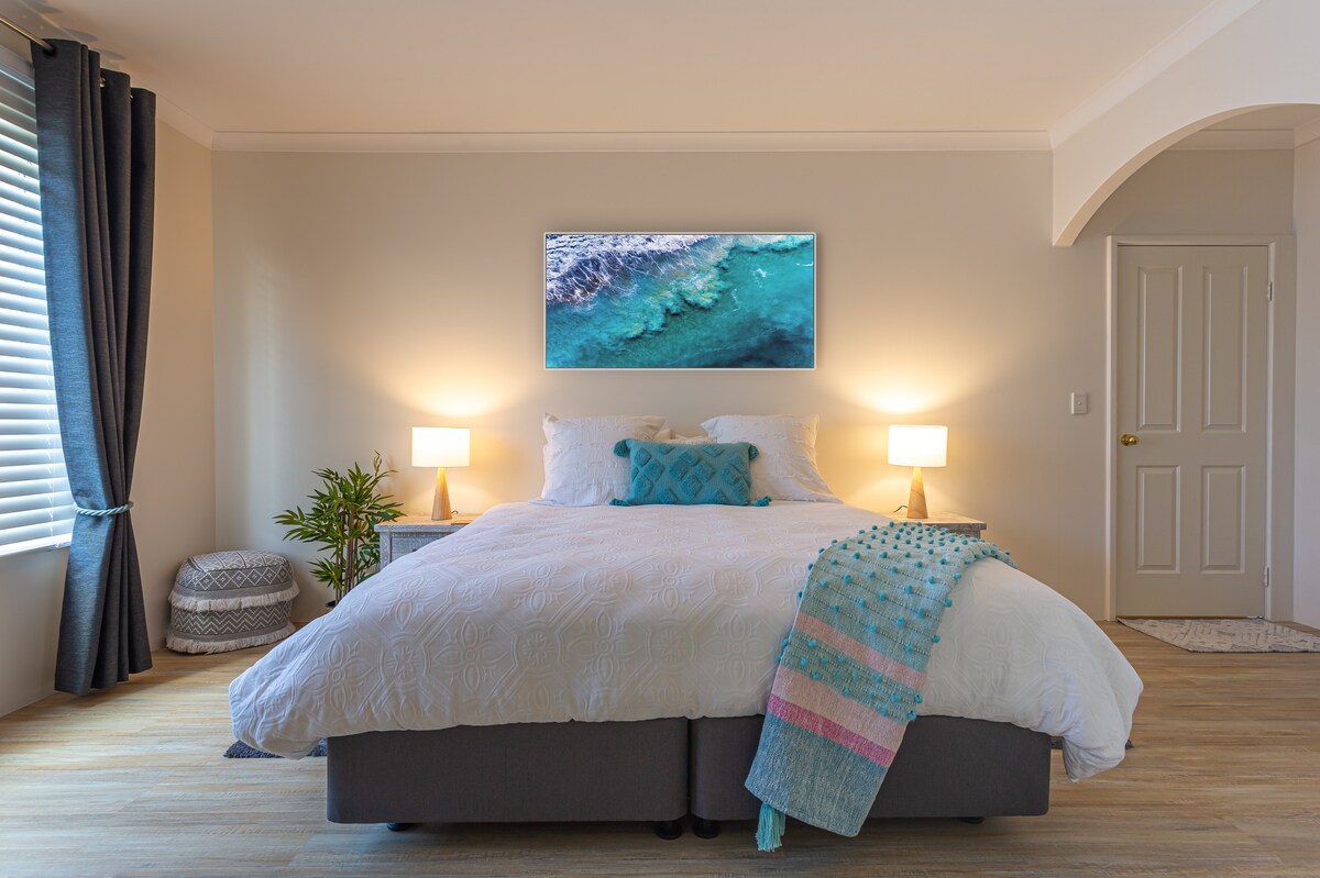 In a little bay near wine and waves, nestles a magical home awaiting your arrival. Whalebone is a haven for peace, tranquillity and laid-back exploration. Perfectly positioned just footsteps from the aqua waters of Geographe Bay, enjoy French linen dressed beds in our breath-taking bedrooms decorated in rich earthy tones, gorgeously collated interiors, and our expansive ocean-side deck offering bay glimpses. Just add delicious delicacies from Margaret River …and you may never want to leave…