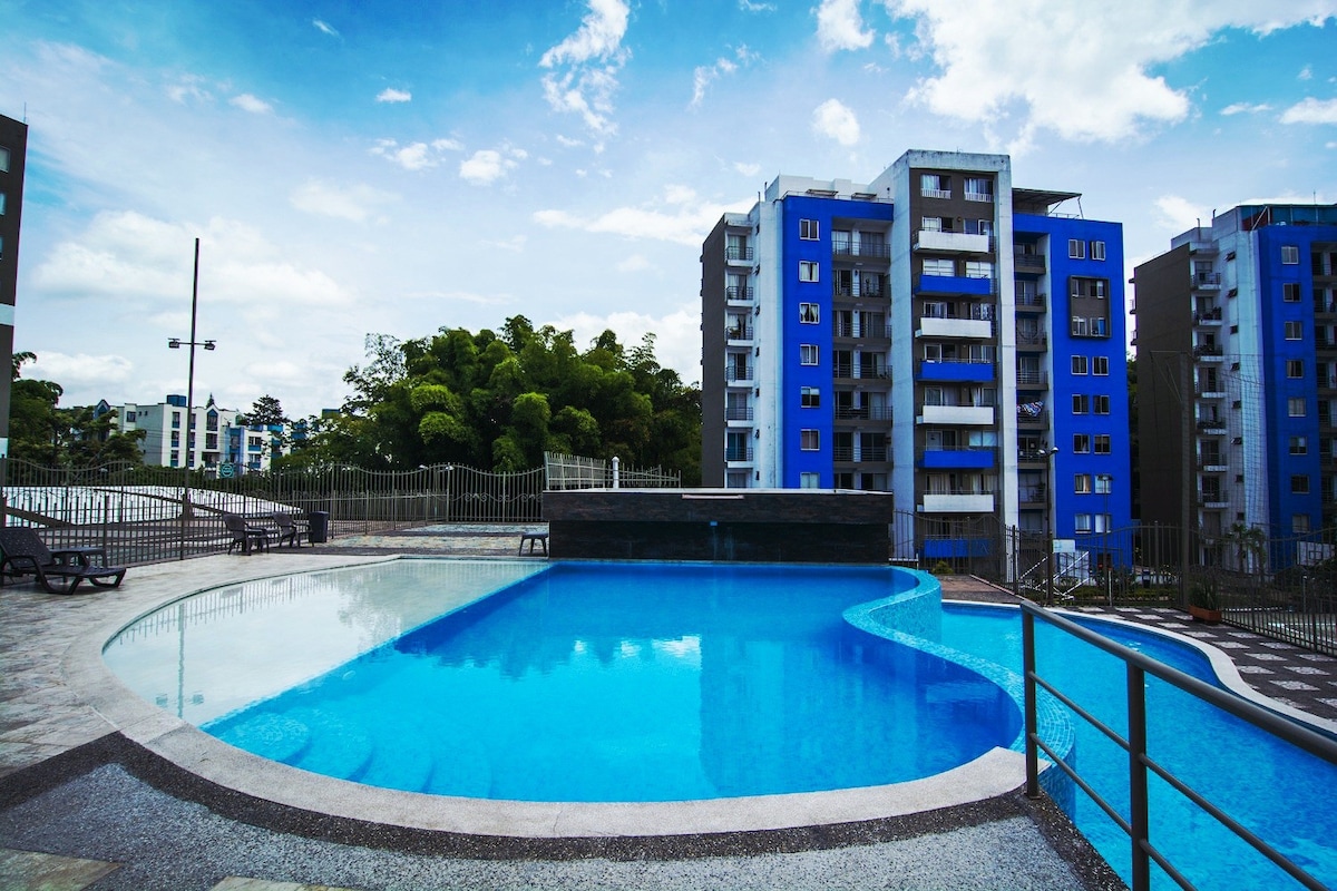 Hermoso y tranquilo apartamento ubicado en el corazón de Armenia pensado en tu comodidad ya sea que nos visites por trabajo o por vacaciones. Aquí podrás disfrutar de espectaculares vistas y lindas zonas comunes, piscina, sauna, turco y jacuzzi. También un gimnasio y cancha de basquetbol. Somos la mejor opción mientras visitas el Quindio y haremos de tus días una gran experiencia. Nos encuentramos a minutos de los mejores centros comerciales, clínicas y universidades de la ciudad.