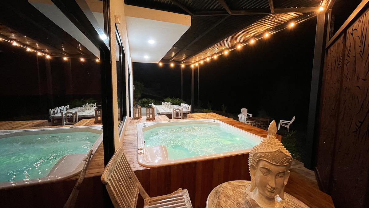 Kick back and relax in this calm, stylish three level space. Listen to the sounds of nature all around and enjoy bird watching on the terrace. This house has three bedrooms with Queen size beds on the main floor; each with it’s own private bathroom and a huge master suite with free standing tub on the second floor. The terrace dining table seats 10 people comfortably. The lower level has a pool table and 3 hanging beds to relax on. A few steps away, there is a garden jacuzzi for up to 8 people.