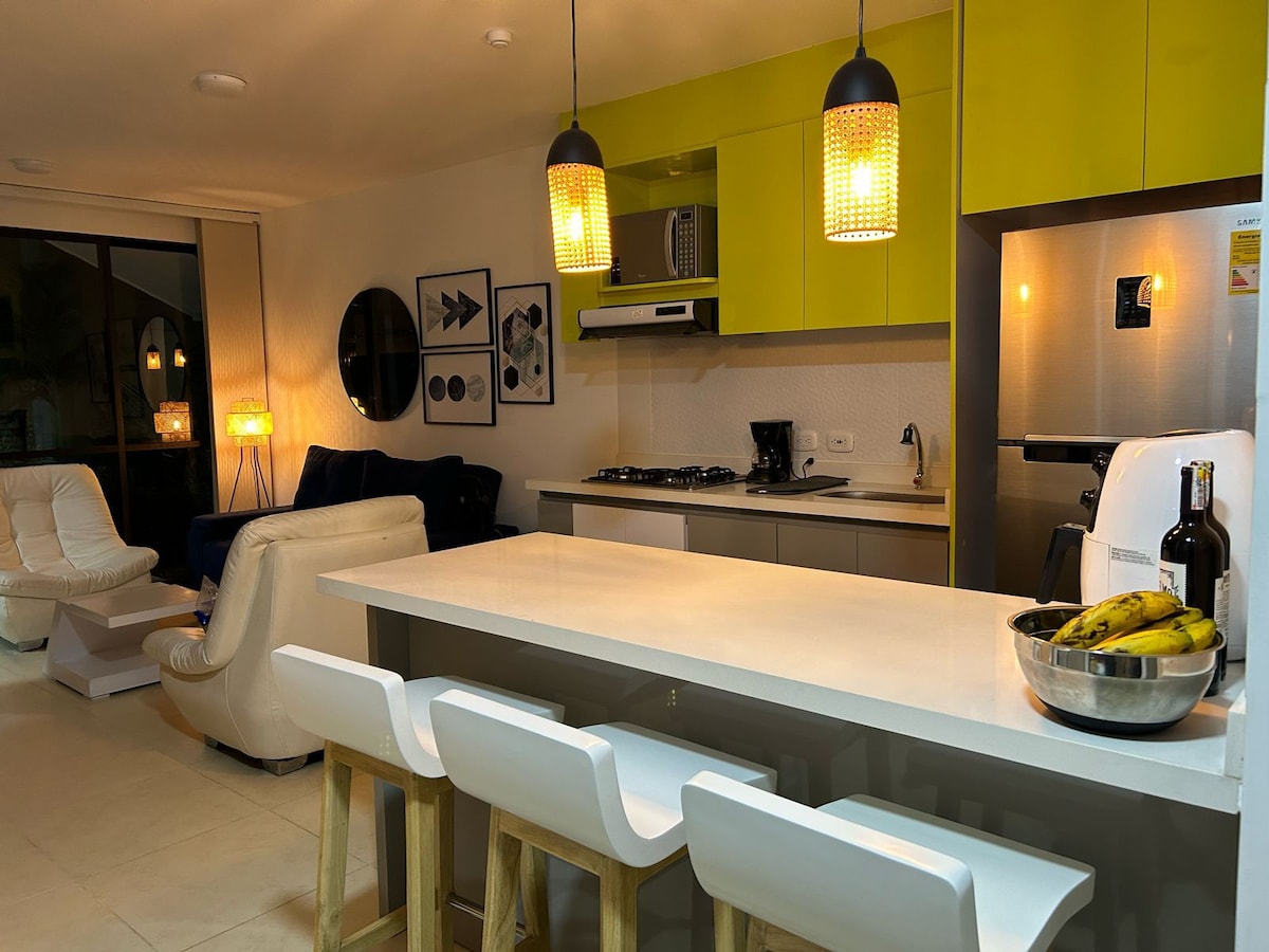 Your perfect haven in the heart of Quindío. Enjoy a cozy apartment for up to 4 guests, ideal for rest and relaxation. It features a spacious bedroom, private bathroom, walk-in closet, living room with a sofa bed, dining area, workspace, and a fully equipped kitchen. Unwind on the balcony with views of beautiful sunsets, pools, and gardens. Prime location just minutes from El Edén Airport in Armenia and close to Parque del Café and Panaca. Ideal for rest, work, or exploring.