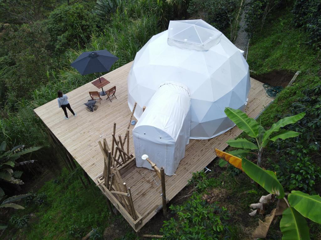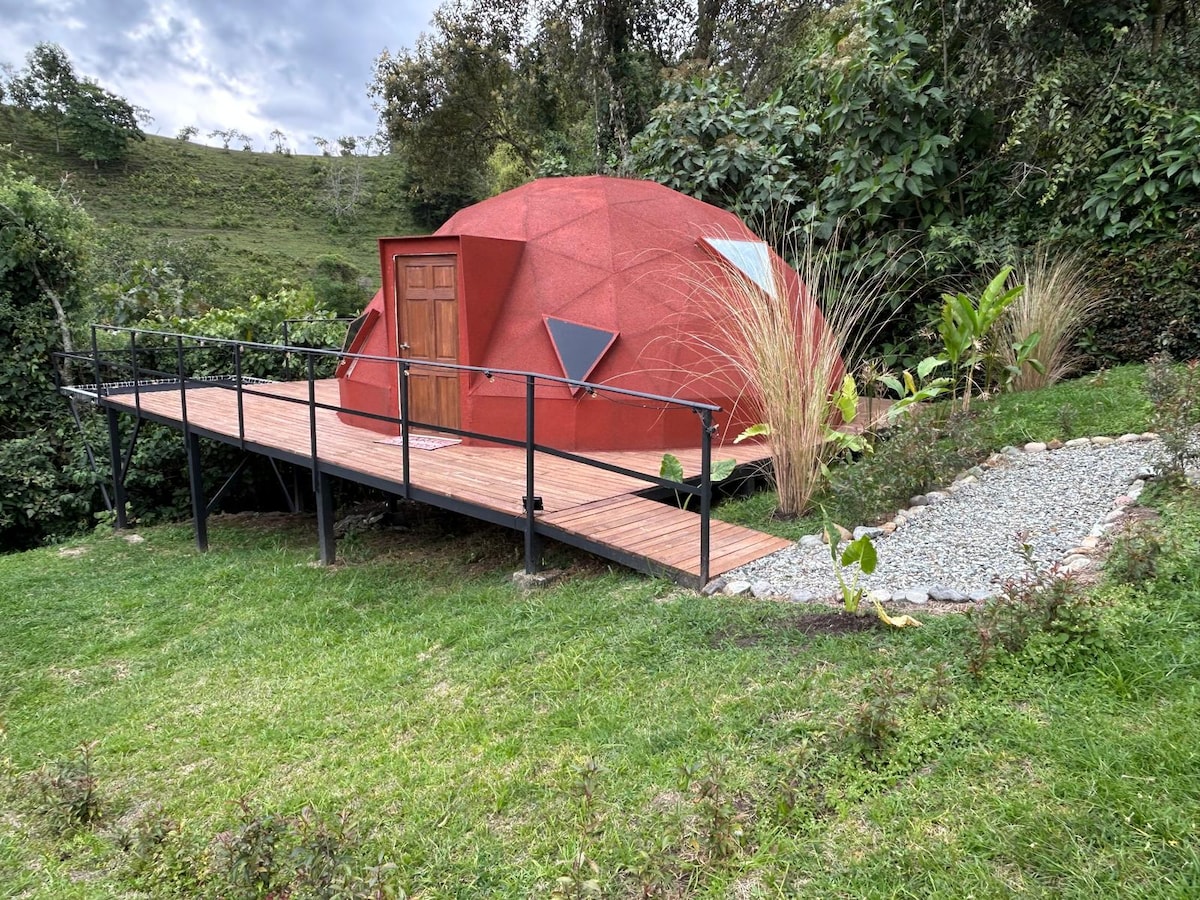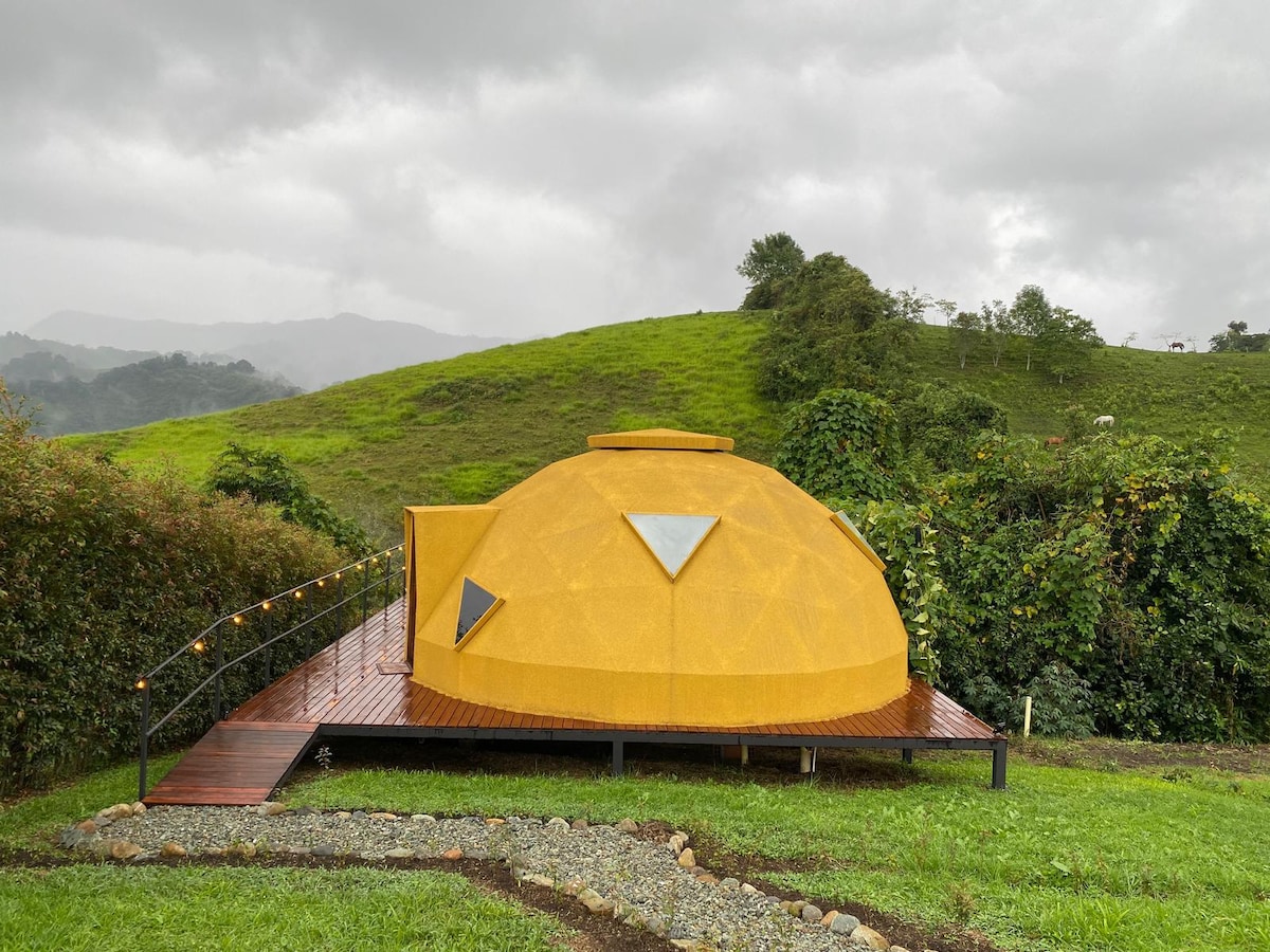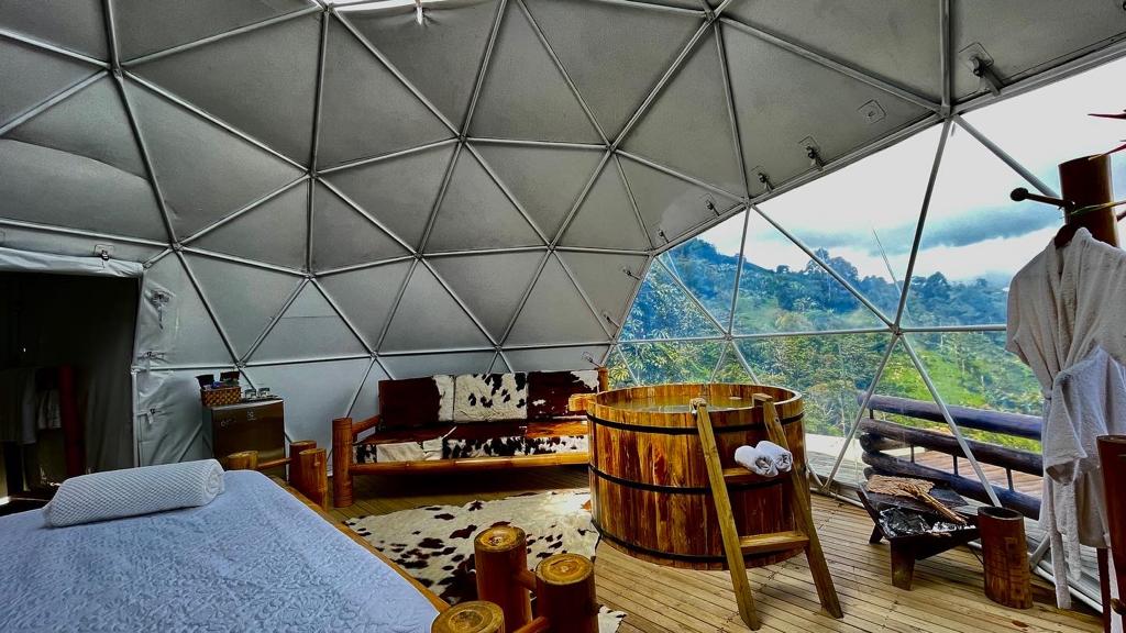 Eco domo fabricado en material reciclado, forma geodésica, con secciones en cristal que permiten disfrutar del paisaje cultural cafetero y techo en vidrio para ver las estrellas desde la comodidad de tu cama. Igualmente, puedes relajarte en un jacuzzy privado con 120 chorros de hidromasaje, junto a tu pareja y disfrutar del calor de una fogata en medio de la naturaleza.