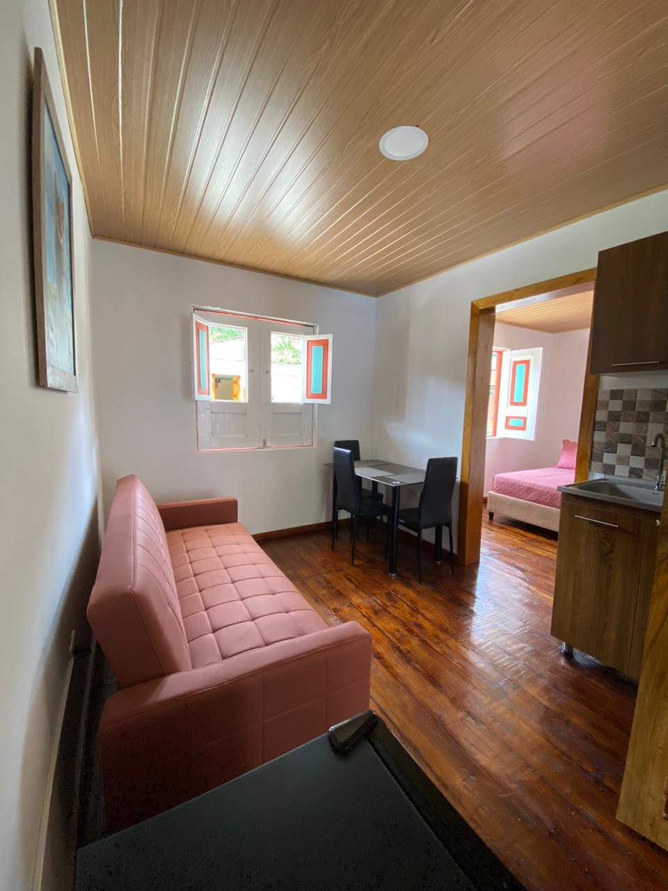Lindo apartamento ubicado a ingreso del Municipio de Filandia, de 72 metros cuadrados. Cuenta con cocina completamente equipada, baño, sala comedor, la habitación principal cuenta con una cama doble y cuenta con otra habitación con una cama doble y un camarote, con una capacidad total de máximo 6 personas.
