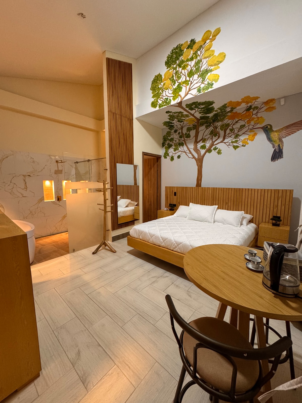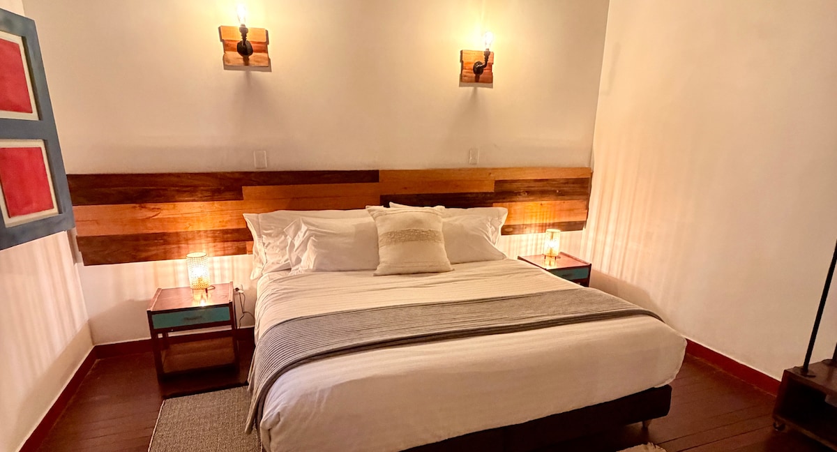 Vive una experiencia única en nuestro hotel boutique, rodeado de naturaleza, con desayuno típico incluido. La habitación Veranera ofrece cama king de 2x2 m, baño privado con todas las comodidades, TV de 32" con Roku (Netflix y HBO Max), vista al jardín. Lencería de primera calidad para tu mejor descanso. Ubicada en el segundo piso, con acceso a sala de estar y balcón. En Hotel Tierra Maravilla ofrecemos atención personalizada, amplios jardines y una encantadora zona campestre.