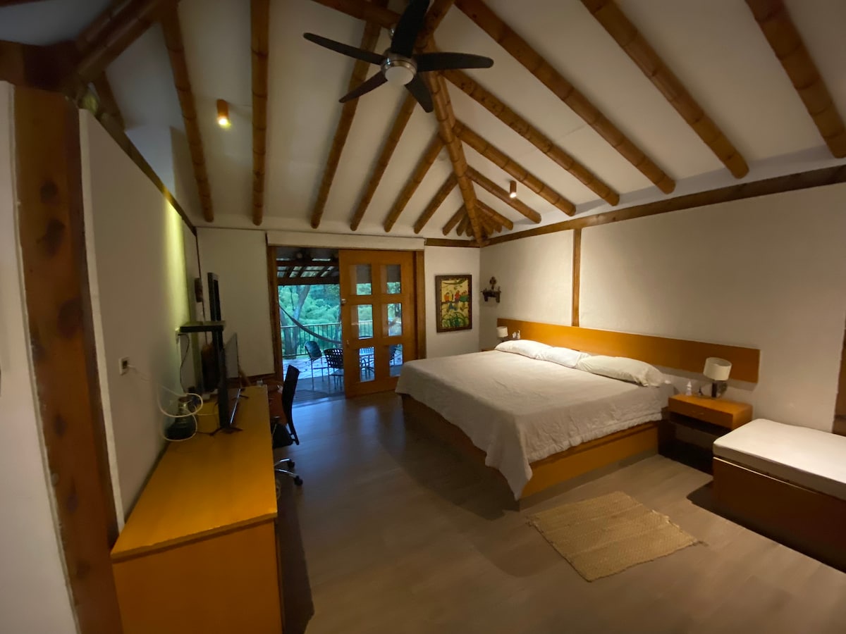 Disfruta de los múltiples espacios de nuestro alojamiento, cómo el Jardín, la Piscina, el Kiosko, Hamacas y Balcon. Encuentras una habitación cómoda, confortable, con muy buena iluminación y Baño privado. Despierte con la música de los pájaros y descansa en nuestro amplio jardín y piscina. Disfruta de una buena taza del mejor café del mundo, observando las gran variedad de aves. La Ubicación es perfecta para visitar la región, estamos cerca a todas las atracciones turisticas.