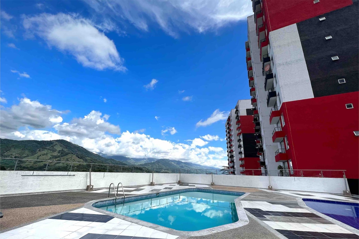 Sensacional y elegante apartasol rodeado de naturaleza; totalmente equipado para una placentera estancia. Podrás disfrutar de un lugar impecable, nuevo con un diseño fresco y acogedor; vigilancia las 24 horas. A 5 minutos del Aeropuerto y 20 minutos del Parque del Café. Comodidades tipo resort: 3 piscinas, tobogán, juegos infantiles, jacuzzi, BBQ, lavadora. Situado estratégicamente para conocer todo el eje cafetero y ciudades como (Pereira 1h30m y Cali 2h30m).