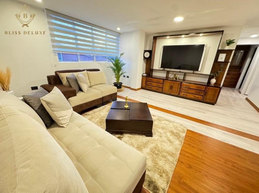Este elegante alojamiento es ideal para noches de pareja, familia corta o estadías largas de trabajo. Contamos con jacuzzi dentro del departamento, chimenea de bioetanol y una sala con una pantalla de 85” para las mejores noches y experiencias inolvidables de sus vacaciones. Cama tamaño king y hermosos balcones. Cocina propia con todos los implementos necesarios. Cerca de lavanderías, tiendas, restaurantes. Parqueadero propio y cámaras con vista a la calle para su tranquilidad.