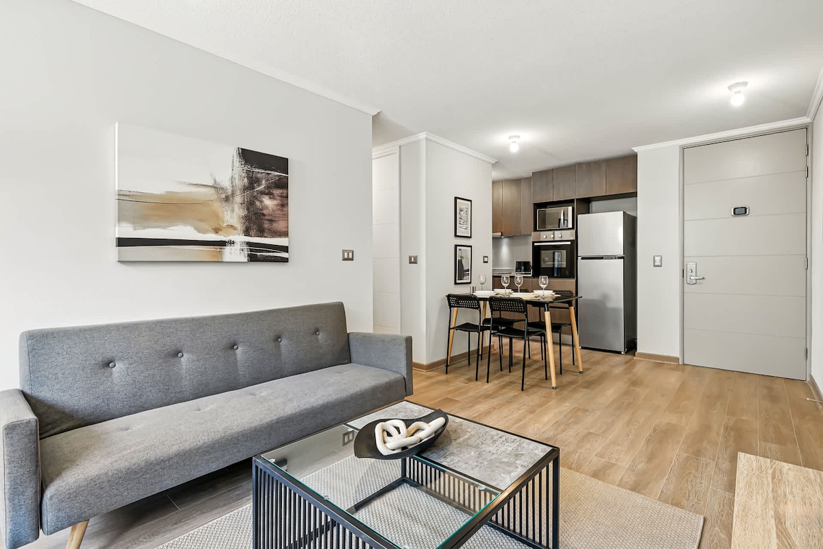 Departamento nuevo, elegante, con ventanas termo panel , moderno y tranquilo. Ubicado en el casco histórico de Santiago, ideal para descanso tras la jornada laboral. En el sector encontrarás restaurantes y bares a pocos pasos. Cercano a metro y locomoción pública. Perfectamente equipado para que te sientas como en casa. Lee las reseñas de nuestros huéspedes para que nos conozcas un poco más Departamento en segundo piso, con vista a piscina en patio interior y cuenta con ascensor.