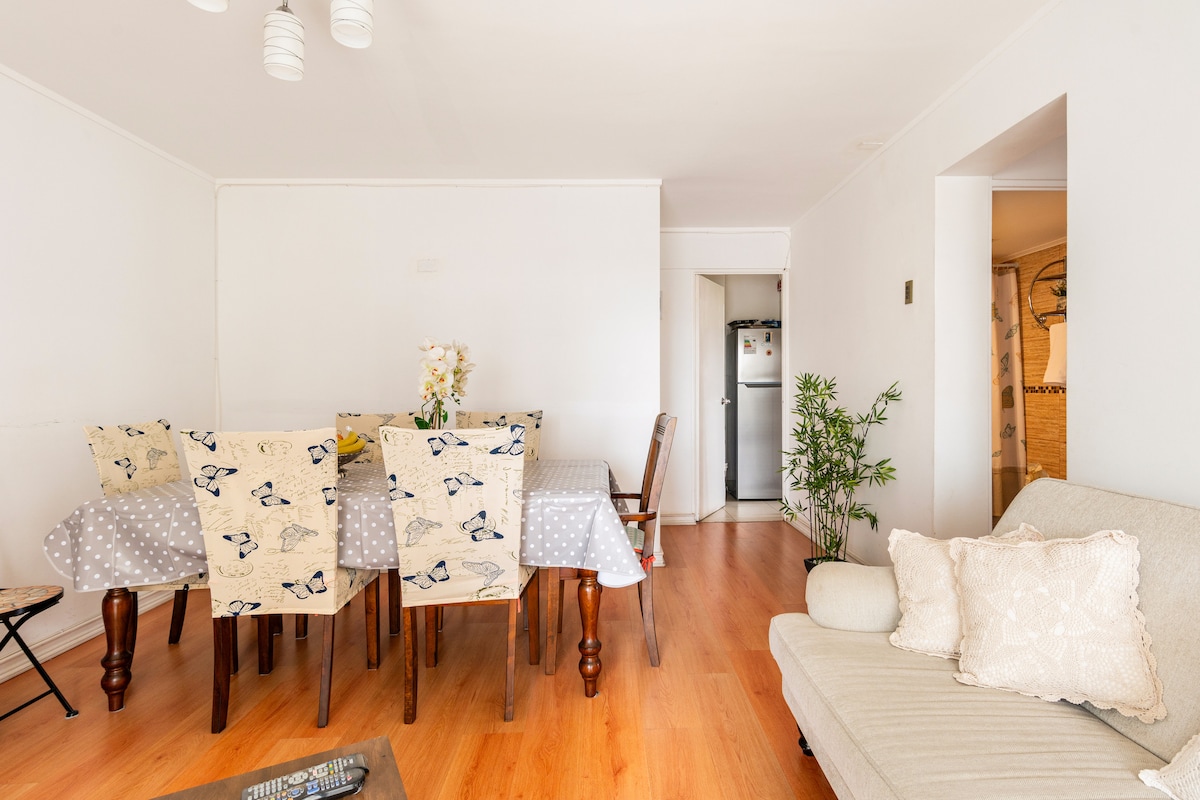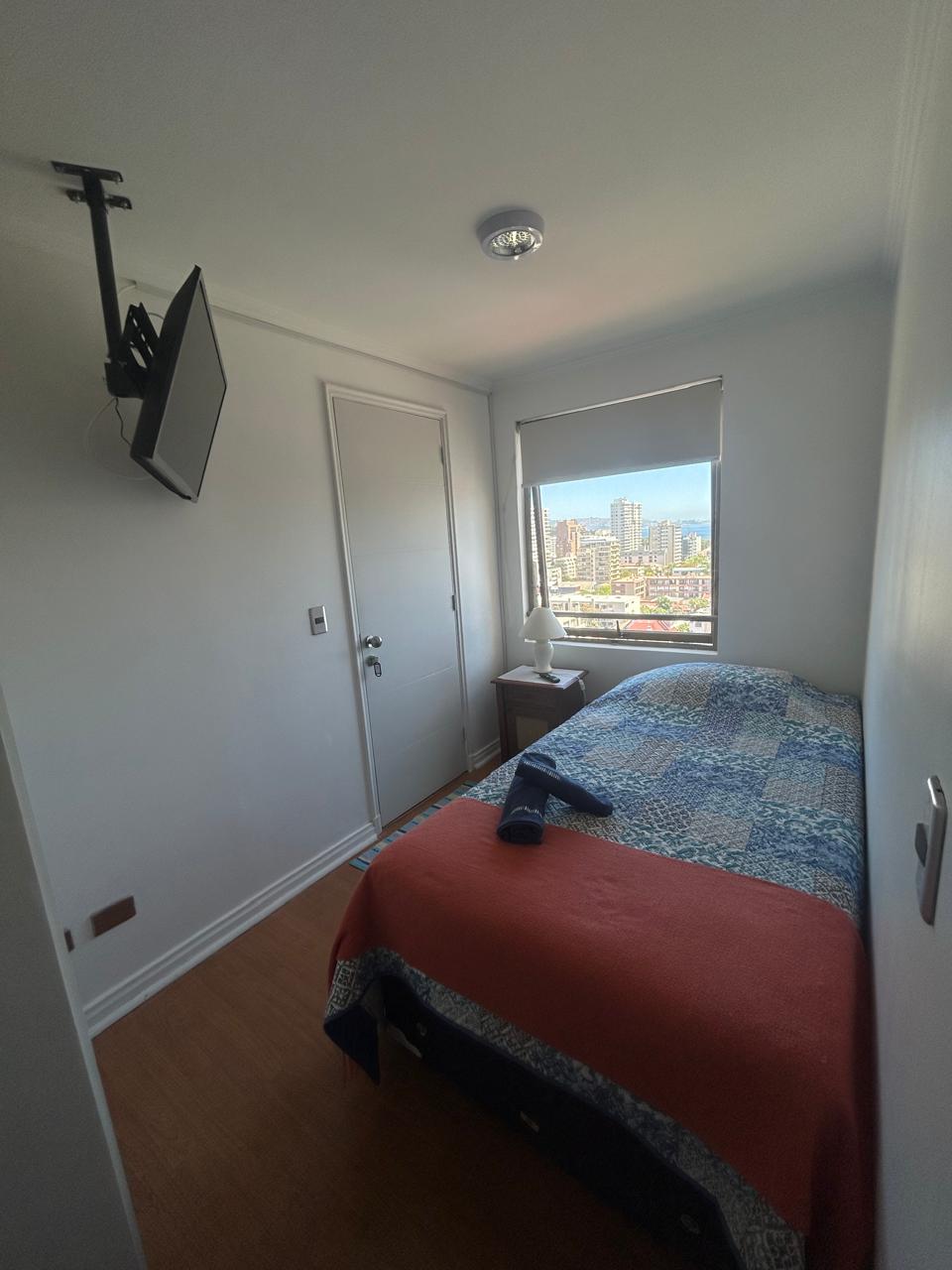 Depto. con excelente ubicación. A 2 cuadras del Terminal de Buses de Viña. A 4 cuadras de la Plaza de Viña y a 1 cuadra del metro. Depto. soleado con 2 balcones. Cómodo, muy bien cuidado. Seguridad 24 horas. Estacionamiento subterráneo. Tiene habitación matrimonial, 2 baños, living, cama nido de 1 plaza. Cocina full. Incluye ropa de cama, toallas y otros. Estricta limpieza. Se dejan alimentos como atención al huésped. Piscina disponible durante el verano. Check in y salida libre a convenir.