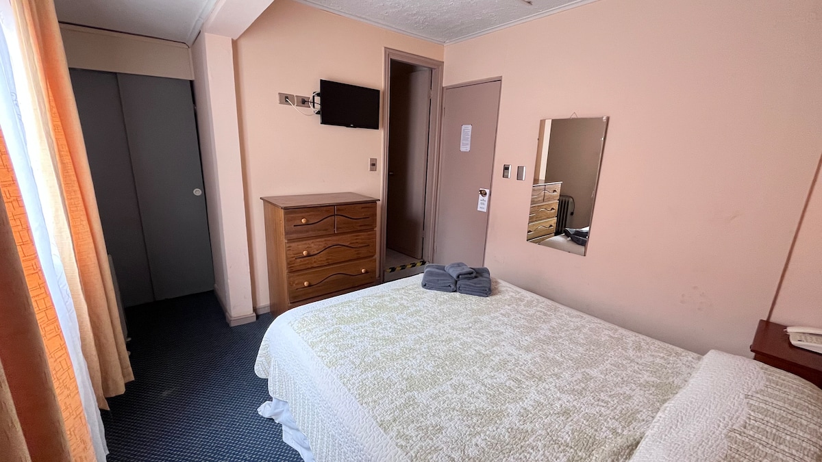 Acogedora habitación para 2 personas con cama de dos plazas, escritorio y grandes ventanales que llenan el espacio de luz natural. Disfruta de desayuno incluido, ropa de cama, toallas y frazadas extra sin costo. Con vista a la vibrante Av. Valparaíso, en pleno centro de Viña del Mar, cerca de todo. Ideal para descansar o trabajar. El entorno puede ser algo ruidoso por la actividad urbana. Atención personalizada las 24 horas.