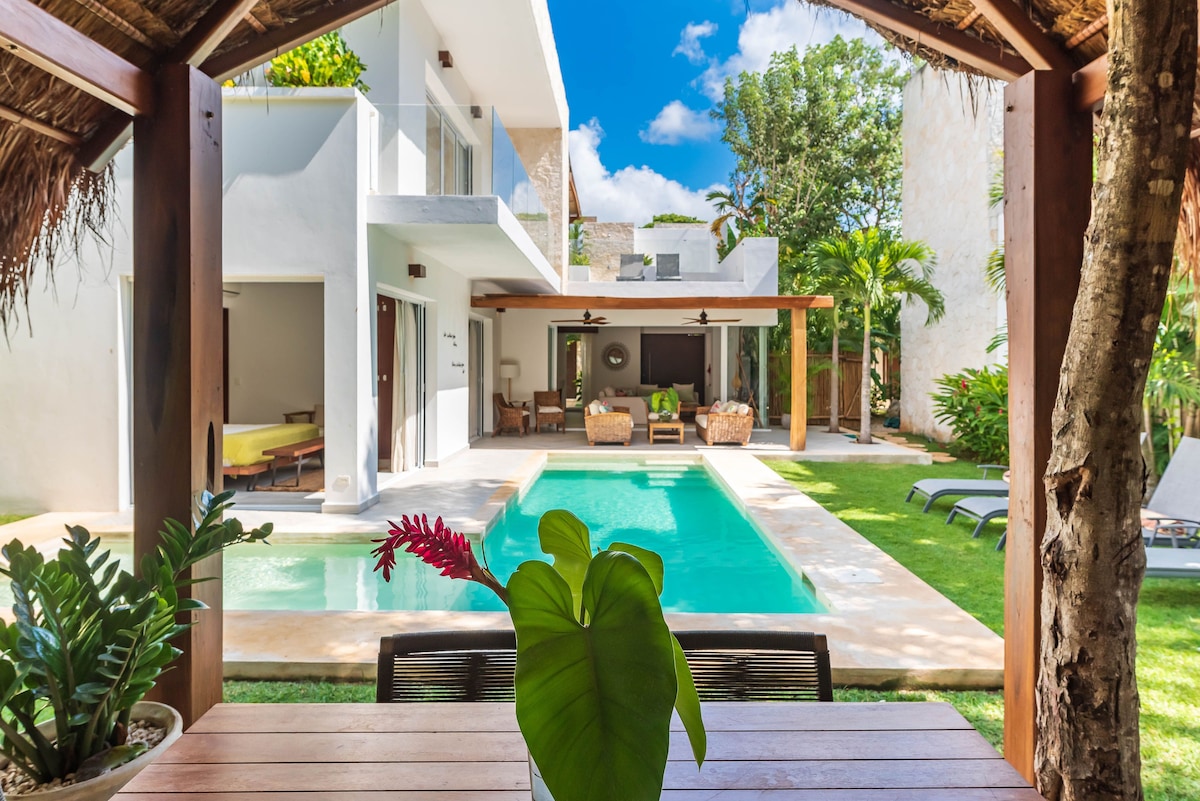 Hermosa villa en Condominio horizontal con total privacidad, seguridad y atención 24 hrs. Piscina XL, jacuzzi y jardín exclusivo para los huéspedes de la villa. A pocos pasos de restaurantes y locales, del Centro de Tulum. Ofrecemos servicios opcionales como transfer del aeropuerto, renta de bicicletas, masajes, chef y excursiones. NO hay construcciones cercanas, por lo disfrutarás tranquilamente tu estancia. Todas las habitaciones tiene baño privado y vista hacia la alberca y jardín.
