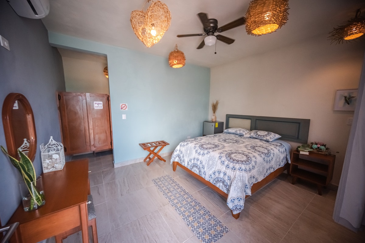 This air-conditioned studio sits in a quiet corner of the property and includes a double bed, perfect for a solo traveler or couple seeking a peaceful long-term base. The fully equipped kitchen with gas range and oven makes healthy cooking easy. Enjoy coffee on the porch or rooftop patio with daily birdwatching. With fast, reliable WiFi and soft, sanitized bedding, this studio offers a calm, comfortable home for extended stays.