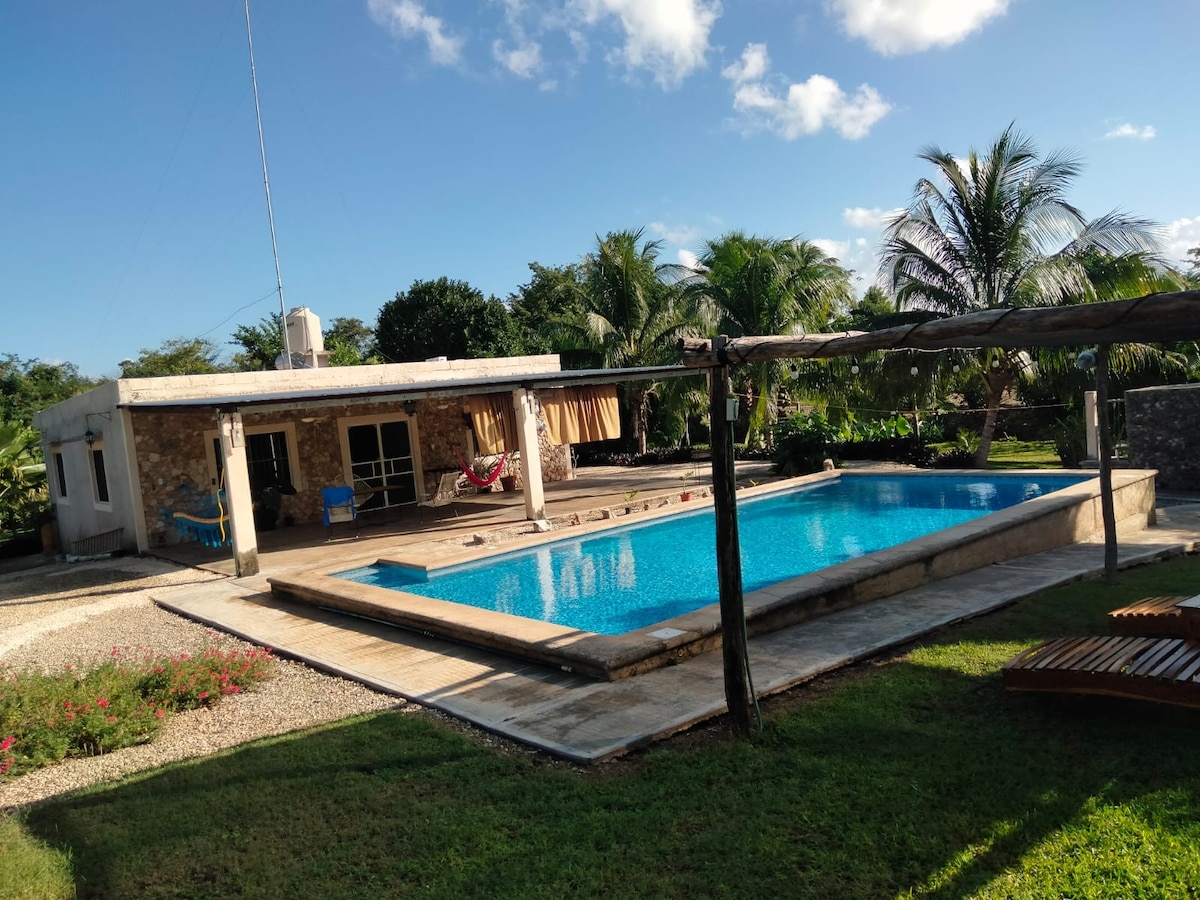 Discover serenity in our charming vacation home, just 5 km from Izamal. For your convenience, arriving by car is recommended, as we are not located in Izamal, but we have parking facilities. Immerse yourself in the tranquility of nature with our beautiful pool, constructed with authentic Maya material. Step into a cozy bedroom with a double bed and all the comforts of a home. Your perfect retreat away from the hustle and bustle of the city!