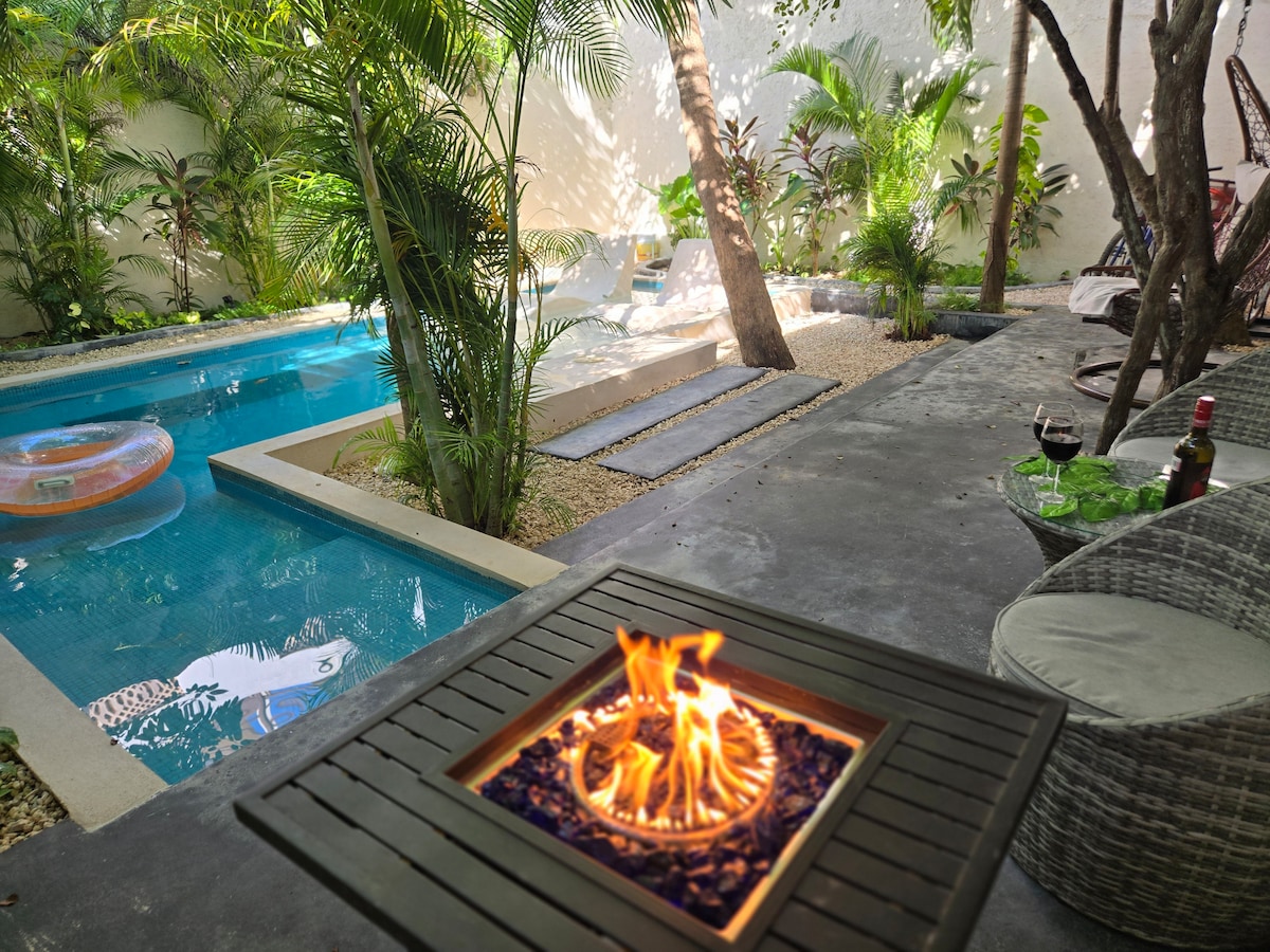 Feel right at home in this cozy and private PentGarden studio on the ground floor. Designed with stylish Tulum-inspired furniture, it features an equipped kitchen, a private patio with plunge pool, a sofa bed and large Smart TV, and a full bathroom with a beautiful glass wall with view to the bedroom. Stay cool with A/C, and enjoy a smooth arrival with self check-in via digital lock. Shared amenities include: A rooftop with infinity pool, grill, fire pit, outdoor shower, and restroom.