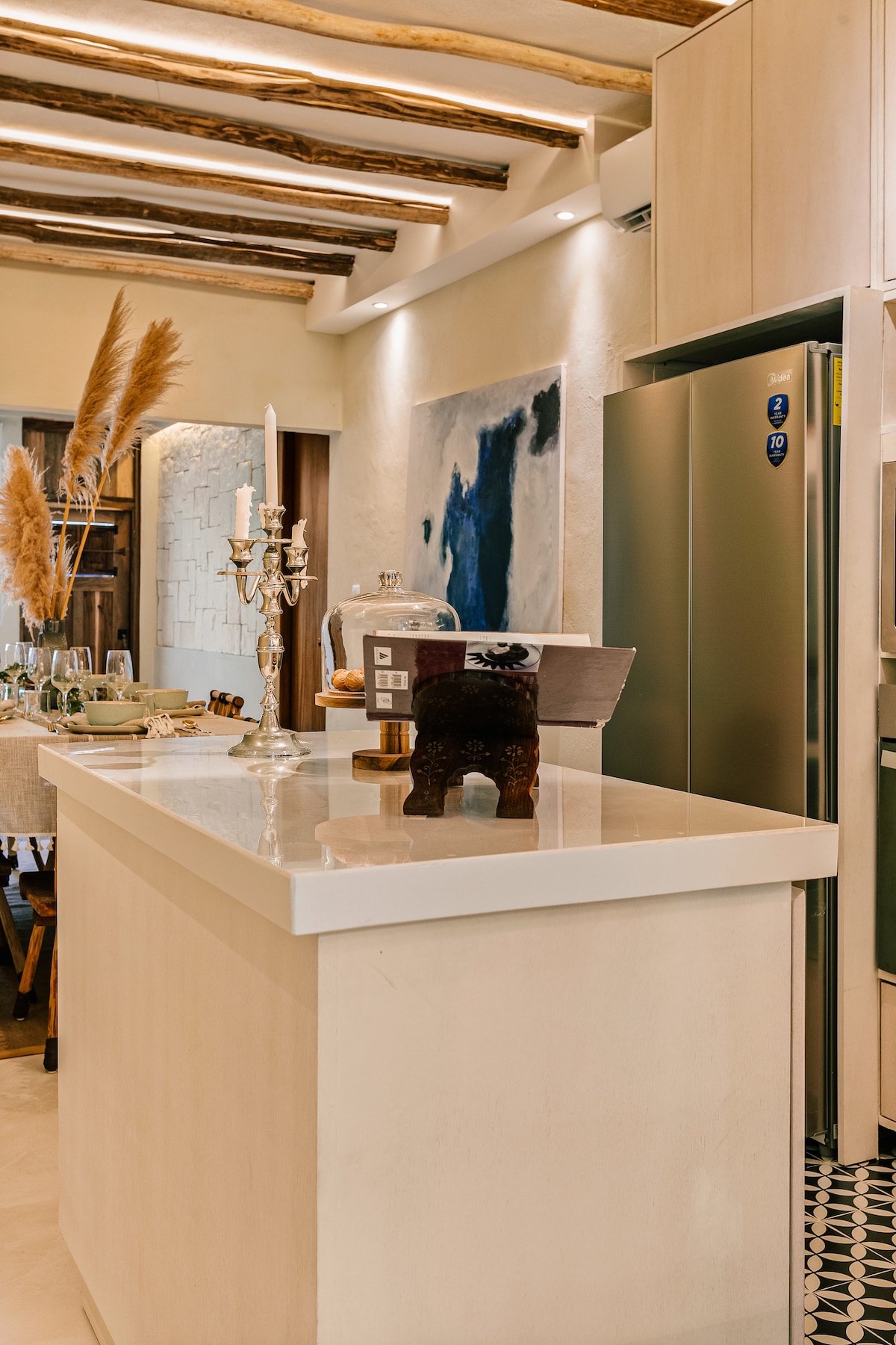 Villa Tica, recently remodeled modern villa & exquisitely designed is walking distance to Tulum Town Center, yet surrounded by nature. The Villa features a beautiful open space with a fully equipped kitchen, dining area, living room, a peaceful private pool area and lush tropical garden, 3 bedrooms, 4 full bathrooms and a big wood terrace. This spacious,high end furnished and equipped place is meant to offer comfort, convenience and is perfect for a big family or group.Concierge & Security 24/7