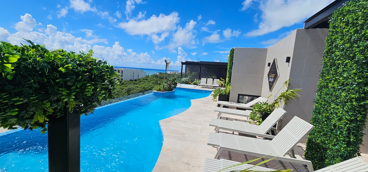 Stunning loft apartment with direct access to pools, near Tulum center and only a few minutes from the spectacular beach and Tulum beach clubs. Enjoy several stunning swimming pools, a roof top pool, sun beds, nice gym, 24/7 staff, strong A/C, elevator, fast Wifi (400 Mbps), blackout curtains, 55" smart TV, a fully equipped kitchen and private parking. Experience outdoor dining or just drinks with beautiful panoramic views at the roof top restaurant. Free shuttle to a beach club included.