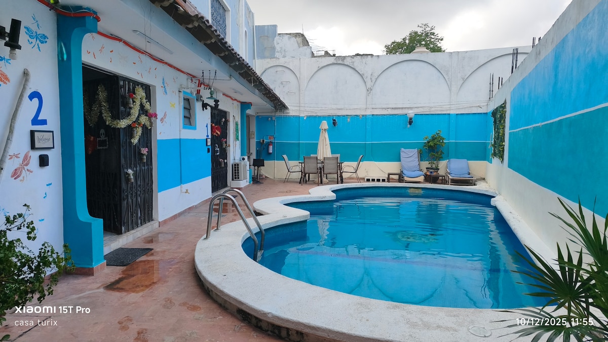 Encantador alojamiento en el centro de Cancún. El acceso hacías el lugar de su estancia es por la puerta trasera de la casa y se llega cruzando un camino de piedra en el área de la alberca compartida. El alojamiento es privado e incluye baño completo y una cocina pequeña, ideal para preparar cosas sencillas o refrigerar alimentos. A pocos metros hay transporte público hacia las playas y, a 5 minutos, la estación de autobuses ADO con rutas al aeropuerto y otros destinos turísticos.