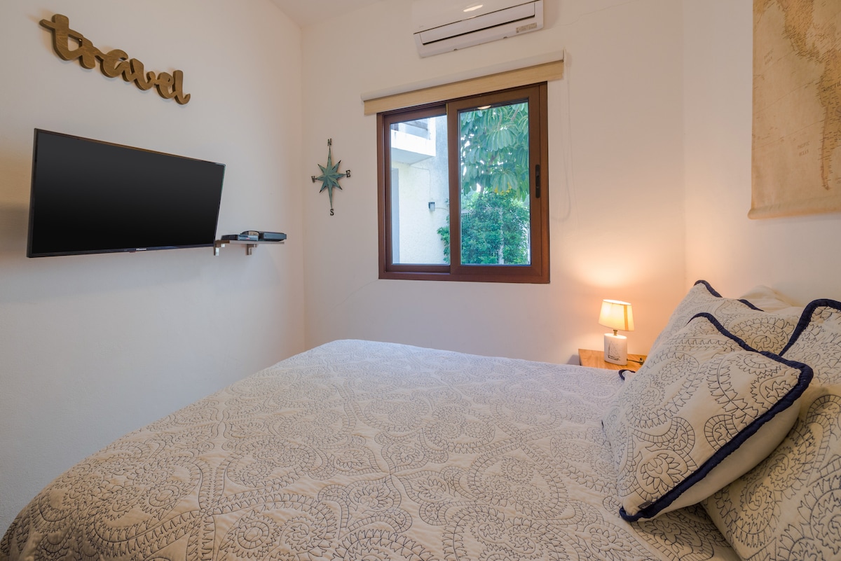 Spacious and comfortable Mexican colonial-style studio with fully equipped kitchen, 1 bathroom, satellite TV, and Wi-Fi. Relax in the cenote-style pool, enjoy another pool with palapa, chairs, and loungers, play on the tennis court, and take advantage of private beach access just 1 minute away. Perfect for couples, solo travelers, business travelers, or those seeking rest, combining comfort, exclusivity, and the best location in Playa del Carmen.