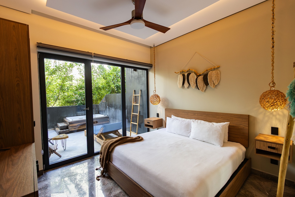 Our home ARKAH, is a one acre jungle oasis with five 2bed/2bath and five 1bed/1bath distancing friendly, 20 minutes from playa del carmen and 20 min from Tulum and only 5 minutes from the spectacular Akumal Beach. Enjoy the cenote shape pool, BBQ grill, sun beds, free parking, strong A/C, fiber optic WiFi (50 Mb/s), fully equipped kitchen. Located on the 2nd floor with lots of natural light and 1 big private terrace.