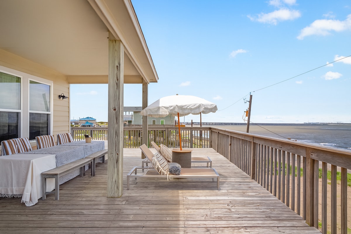 Relax with the whole family at our sturdy & newly renovated beach home, located steps away from the beach. Our large home is situated on an expansive corner lot & features beach and bay views. Enjoy listening to the ocean waves & stunning sunsets while you sip coffee or wine from our oversized deck. Enjoy s’mores from our outdoor fire pit. Our home is not a typical Galveston AirBNB as it is our family’s vacation home and very well maintained.