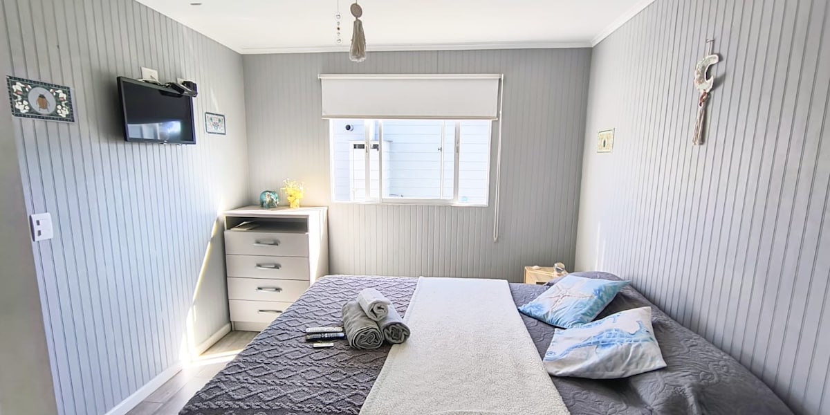 Cabaña rustica de madera y botellas, especial para desconectarse. Cómoda para 2 personas, cama de 2 plazas con sabanas incluidas , toallas de mano en el baño. Cocina encimera y mini refrigerador, parrilla y horno en un espacio en común que se puede utilizar con previo aviso. A 5 minutos de la entrada playa el Tebo, 15 de playa Cau-Cau y 15 de La caleta (caminando) en auto a unos 5 min. Estacionamiento compartido ya que la cabaña queda en el patio de nuestra casa.