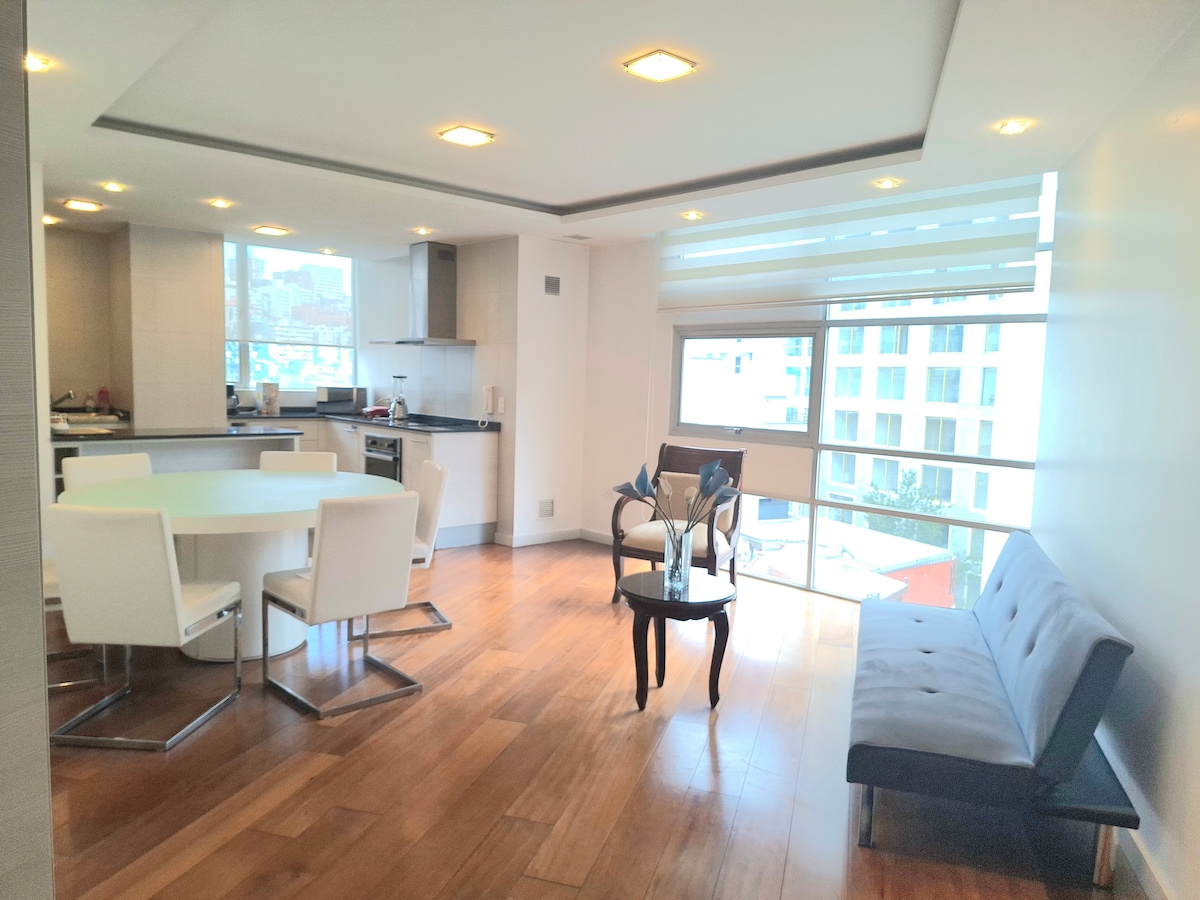 Enjoy a cozy suite in a 6th-floor, just three blocks from La Carolina Park. It includes 1 Queen bed, 1 sofa bed, a full bathroom and 1/2 bathroom. Fully equipped kitchen with everything you need to cook at home: oven, fridge, microwave, coffee maker, cookware—and your own washer & dryer inside the suite Fast 300Mbps Wi-Fi and a 55" TV Perfect for up to 3 guests, up to 4. L Centrally located: just a 5-minute walk to restaurants, cafés, shops, and public transport. Private parking for 1 vehicle