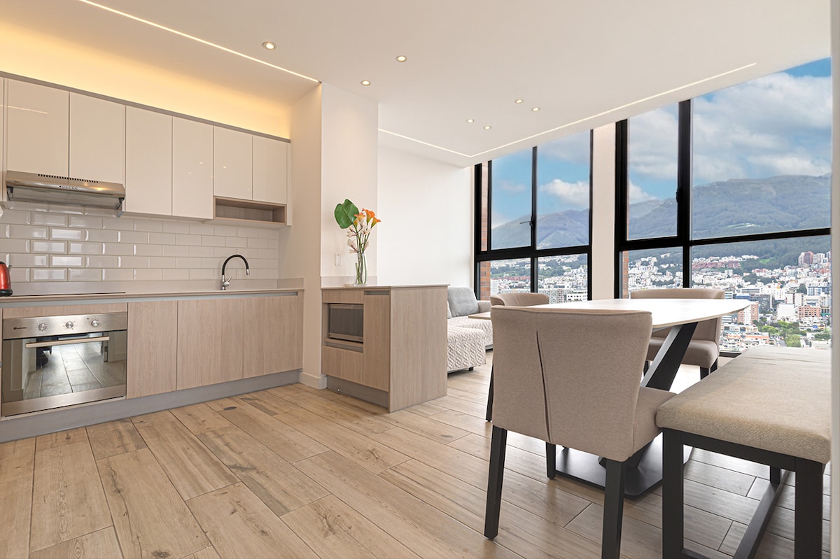 Modern, brand-new studio on the 14th floor with direct views of La Carolina Park. Studio amenities: • High-speed fiber optic WiFi • 55” QLED Smart TV • Ultra-comfortable bed • Fully equipped kitchen • Modern bathroom • Smart lock • 24/7 security Social areas (17th floor): • Gym • Coworking area with WiFi • Game room • BBQ area • Jacuzzi (available only for stays longer than two nights) Prime location, just 15 minutes from the Quito Metro, malls, and restaurants.