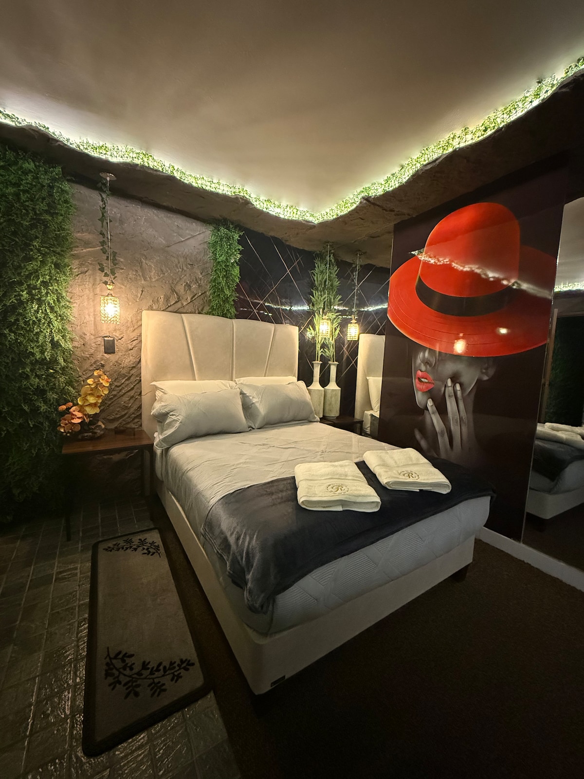 Suite Jungle ubicada en la mejor zona de Quito, a pasos del parque la Carolina. Diseñada para el descanso y el romance. Disfruta de una habitación elegante con jacuzzi privado, iluminación cálida, decoración natural y un ambiente íntimo tipo spa. Cuenta con cama confortable, minibar, cafetera y un espacio perfecto para relajarte. Ideal para escapadas románticas, descanso o momentos especiales en un entorno único, moderno y acogedor.