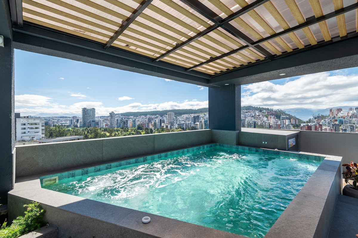 Spectacular suite located just across La Carolina Park. Imagine the view from the 17th floor, whether you're relaxing on the sofa or in bed. Features a fully equipped kitchen, fast internet, and you'll feel right at home. Easy walking access to the Subway, Mall El Jardín, and CCI. Pool - Sauna - Jacuzzi Well-equipped gym Incredible rooftop 60” Smart TV - Netflix Induction cooktop Refrigerator Laundry room inside the apartment Microwave Blackout curtains Clothes iron