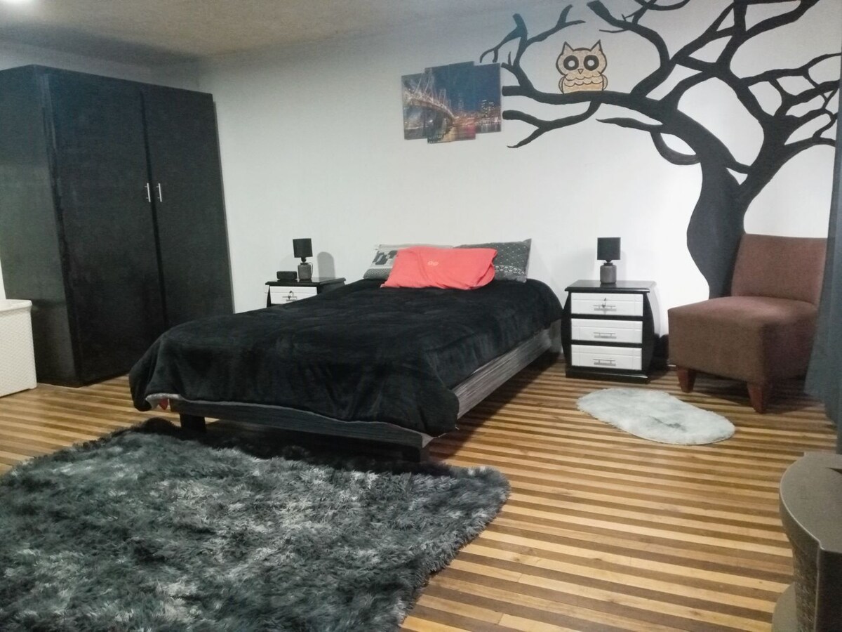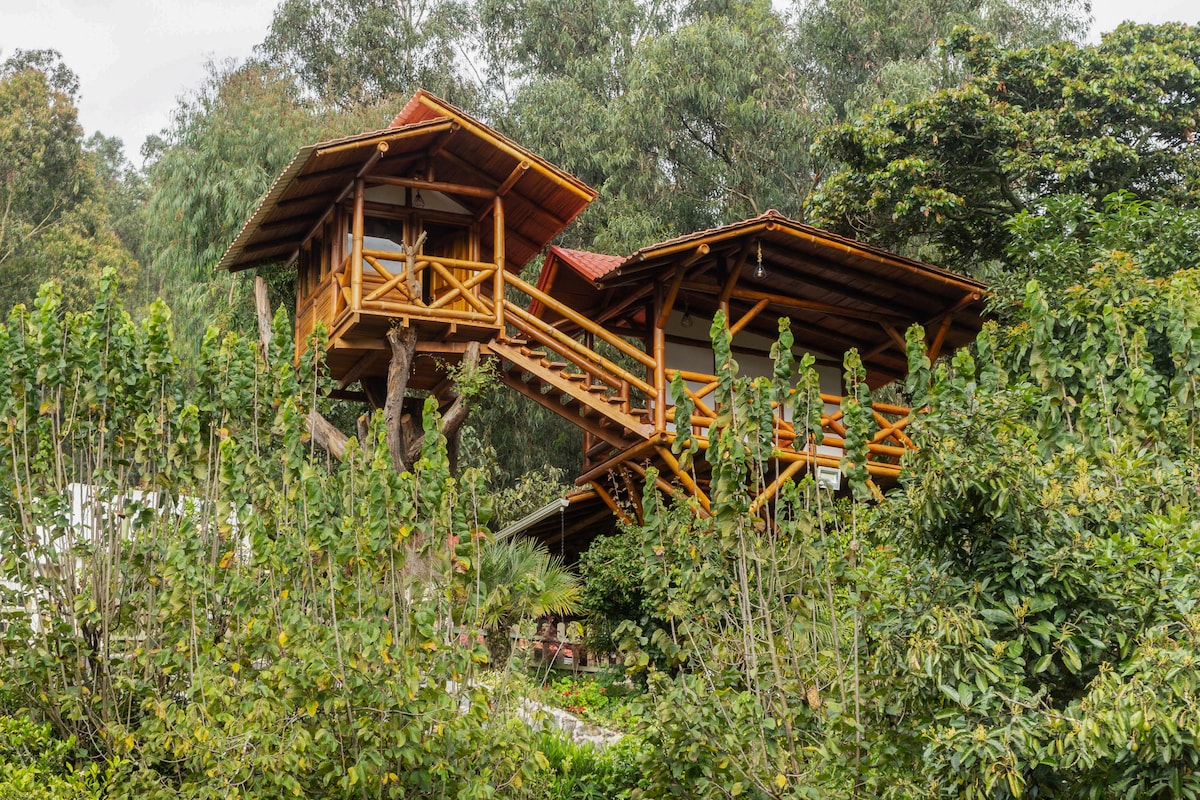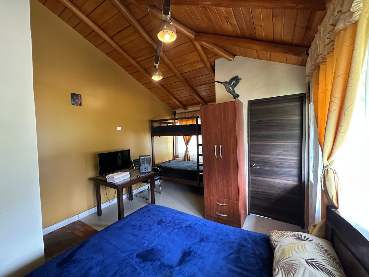 Hermosa suite para pareja, está ubicada en las faldas de la montaña Ilaló, se encuentra dentro de una propiedad con otras 2 viviendas independientes. Amplios jardines, huertas orgánicas, espacio al aire libre, juegos para niñ@s, hamacas y una piscina natural temperada. Hermosa suite: tiene una habitación principal muy amplia y una pequeña habitación con sofá cama adicional. Vista increíble entre los árboles desde todas las ventanas. Muy iluminada y segura. Acceso independiente, parking privado.