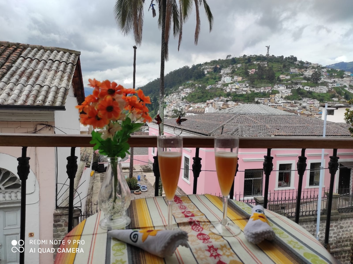 Desde este alojamiento céntrico todo el grupo podrá disfrutar del fácil acceso a todos los atractivos del Centro Histórico de Quito, en un ambiente colonial dónde nuestro personal te ayudará en todo lo que necesites, el departamento cuenta con una habitación con dos camas con hermosa vista al Panecillo, una matrimonial y una sencilla, dos baños, cocina,comedor, bar, todo esto en un ambiente colonial para que te sientas como en casa