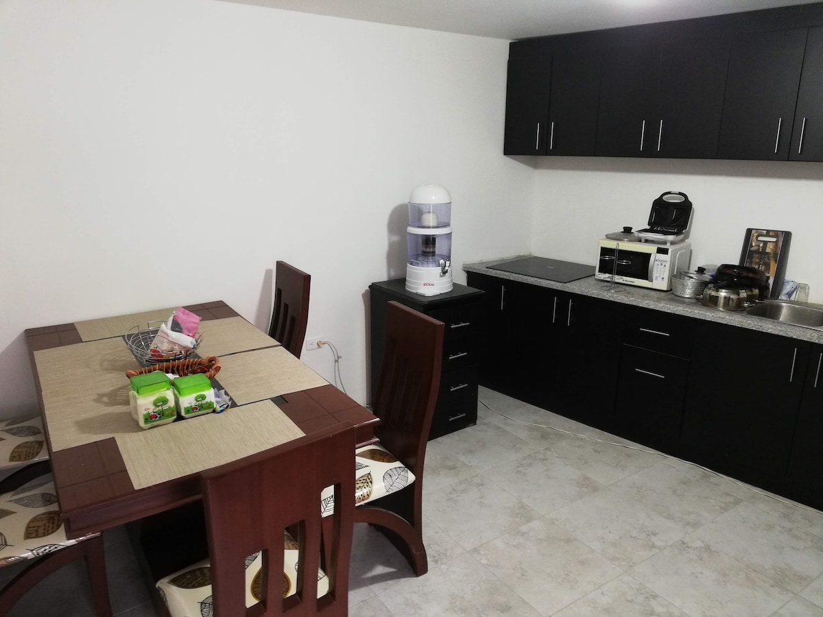 Edificio de construcción nueva. Tres habitaciones amplias cada una con baño y walk-in closet. Completamente equipado, dispone de cocina refrigerador, micro-ondas, para viaje de negocios o placer. El predio cuenta con estacionamiento, ascensor, y es completamente privado. Los propietarios viven en el piso inferior.esta ubicado entre la ruta viva y la avenida interoceánica, muy cerca de la universidad San Francisco, en centro comercial Escala a 20 minutos del aereopuerto Mariscal Sucre