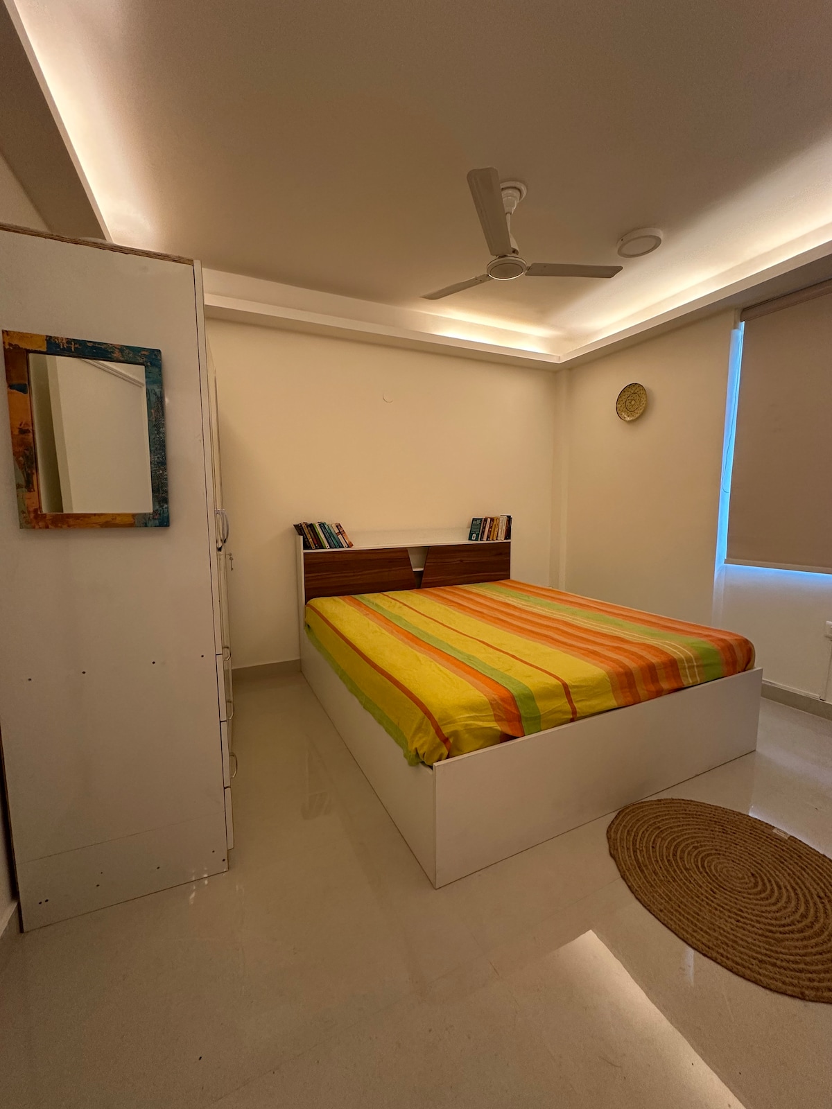 Welcome to our bright and cozy Airbnb! You'll find a well-lit bedroom with a walk-in closet and a private bathroom. The living area is comfy with a sofa cum bed, TV, and some books, plus a handy mini fridge. Step out onto the balcony to relax in the seating area. The bedroom and living room both have AC to keep you cool. You'll have plenty of privacy, a workspace with fast internet, making it easy to work and relax. Enjoy your stay with all the comfort and convenience you need!